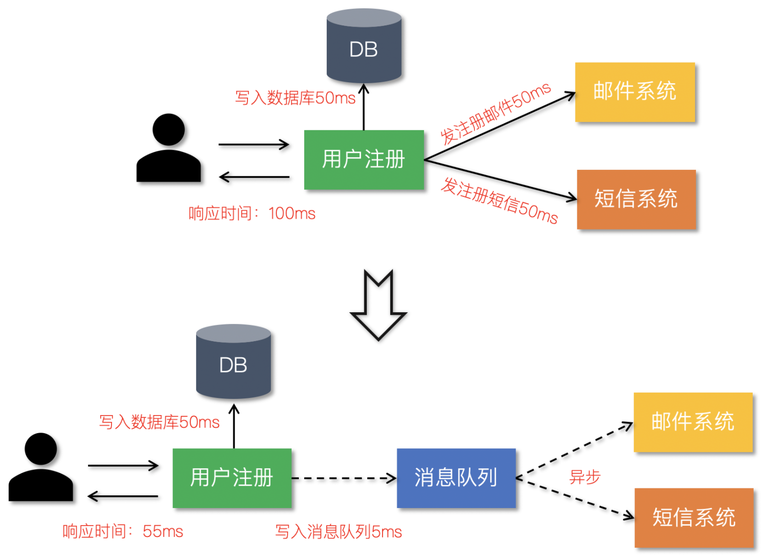 - 参照下图利用消息队列把业务流程中的非关键流程异步化,从而显著降低业务请求的响应时间。