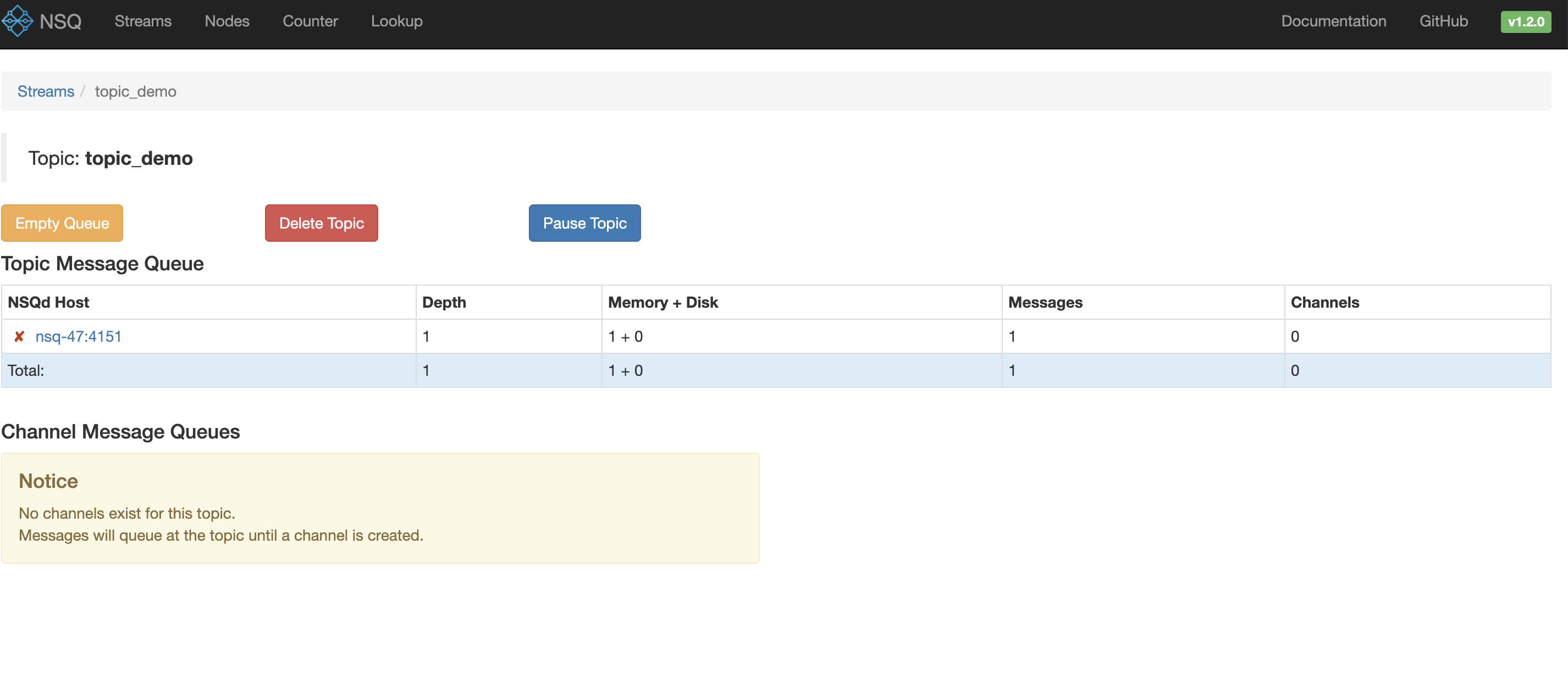 2018/10/22 18:49:06 INF 1 [topic_demo/first] querying nsqlookupd http://127.0.0.1:4161/lookup?topic=topic_demo
