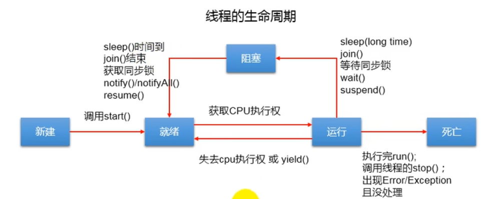 线程的生命周期包括 新建--就绪--运行--阻塞--死亡,它们之间相互切换的方式如下: