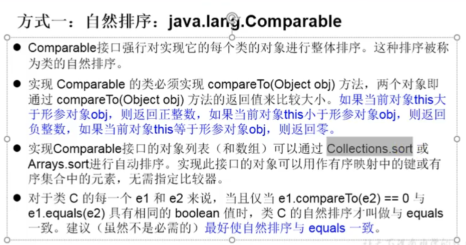 第一种通过自定义类实现Comparable接口,并重写该接口的compareTo()方法,指定我们想要的比较法则,比较的方式一旦确定,后续对该类对象调用sort进行排序时,就会自动使用重写后的compareTo()方法,可在任何位置使用;