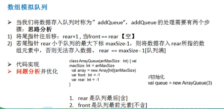 (1)数组模拟非循环队列:(使用一次就不能再用,没有达到复用的效果)注意front表示第一个元素前一个位置,rear指向最后一个元素的位置。