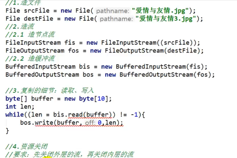 使用和前面类似。只是声明缓冲流时,需要先实例化节点流对象,将其传入缓冲流构造器中,相当于节点流是内层,在外层包了一层缓冲流(先穿内衣,再穿外衣)。注意,资源关闭时,先关闭外层,再关闭内层(先脱外衣,再脱内衣)。(java中关闭外层流的同时,内层流也会自动关闭,所以仅关闭外层即可)