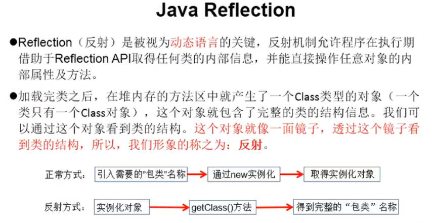 通过反射,运行时类就相当于Class的一个实例化对象,于是可以通过该对象调用运行时类的各种结构(构造器,方法,属性,注解,权限修饰符,返回值类型,异常等等)