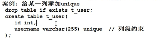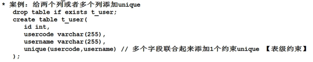 (2)唯一性约束(unique):唯一性约束修饰的字段具有唯一性,不能重复。但可以为NULL(多个值为NULL并不代表重复,因为NULL之间不可比较 )。