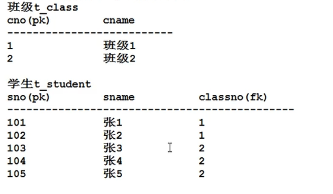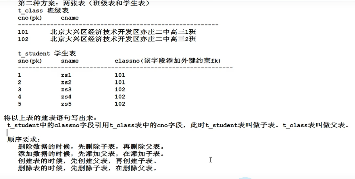 满足第三范式不产生传递依赖的做法:若两张表有一对多关系(如下图中,一个班级可以有多个学生,但是一个学生只能有一个班级),则需要在多的那个表中(即学生表)加外键!(口诀:一对多,两张表,多的表加外键!)