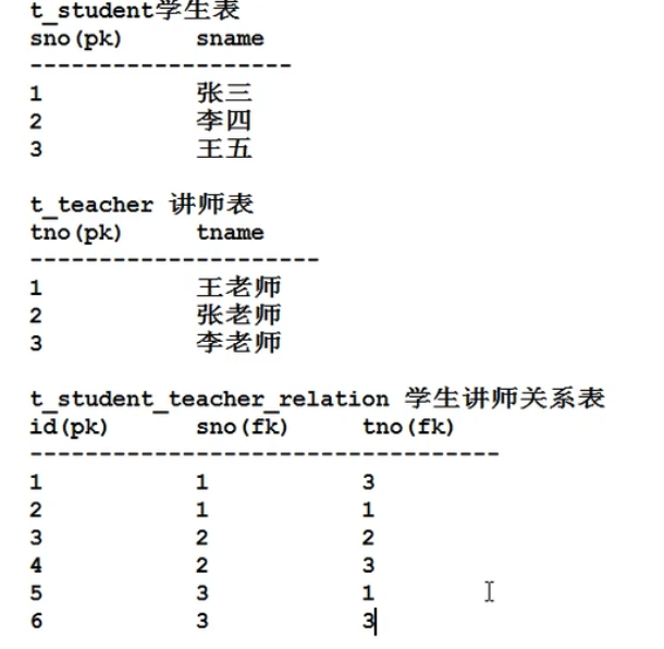 满足第二范式不产生部分依赖的做法:若两张表有多对多关系(如下图中,一个学生可以有多个老师,一个老师也可有多个学生),则需要产生一张关系表,该关系表中有两个外键!(口诀:多对多,三张表,关系表两个外键!)