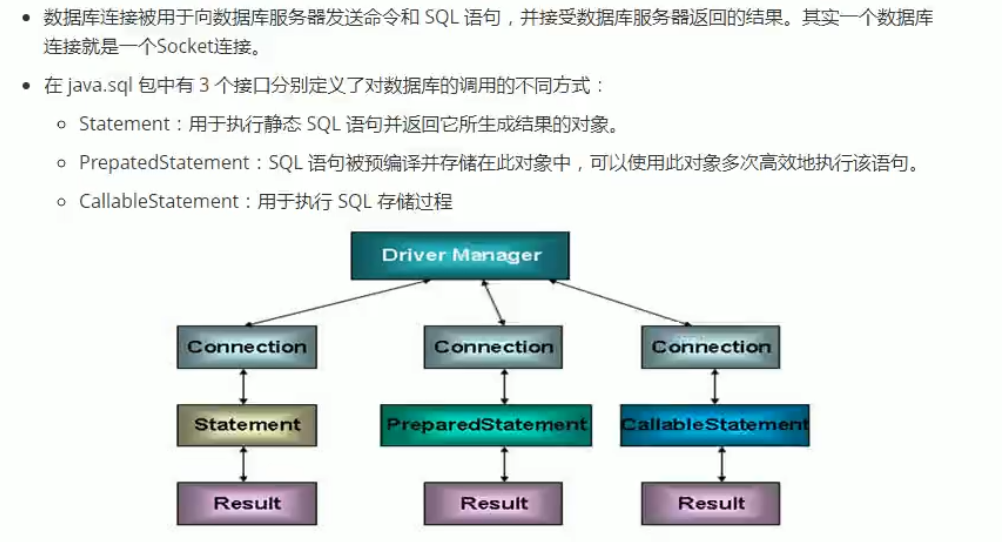 其中PreparedStatement 是 Statement的子接口。但由于Statement有很多弊端(1.需要拼写字符串。 2.存在SQL注入的问题:即指web应用程序对用户输入数据的合法性没有判断或过滤不严,攻击者可以在web应用程序中事先定义好的查询语句的结尾上添加额外的SQL语句,在管理员不知情的情况下实现非法操作,以此来实现欺骗数据库服务器执行非授权的任意查询,从而进一步得到相应的数据信息 。例如输入的用户名或密码不正确时仍然能查到数据 ),因此后续就直接使用PreparedStatement接口执行SQL语句,而不用Statement。CallableStatement接口用于执行SQL存储过程。
