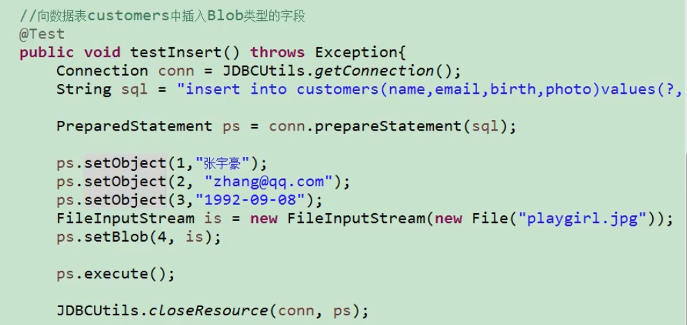 插入BLOB数据:PreparedStatement.setBlob(idx,"xxx");