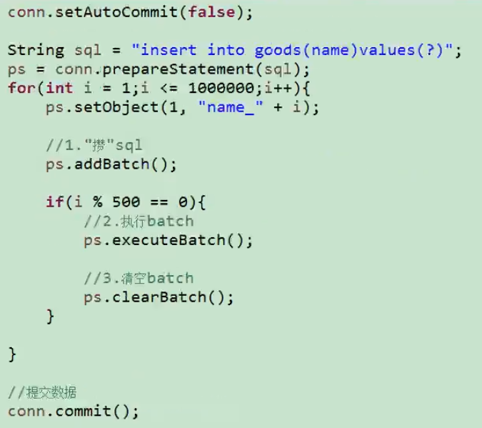 使用PreparedStatement可以实现批量插入,提高效率!如下示例,插入100万条数据,注意要设置不容许自动提交事务,以及批量插入(batch),可以加快插入速度。