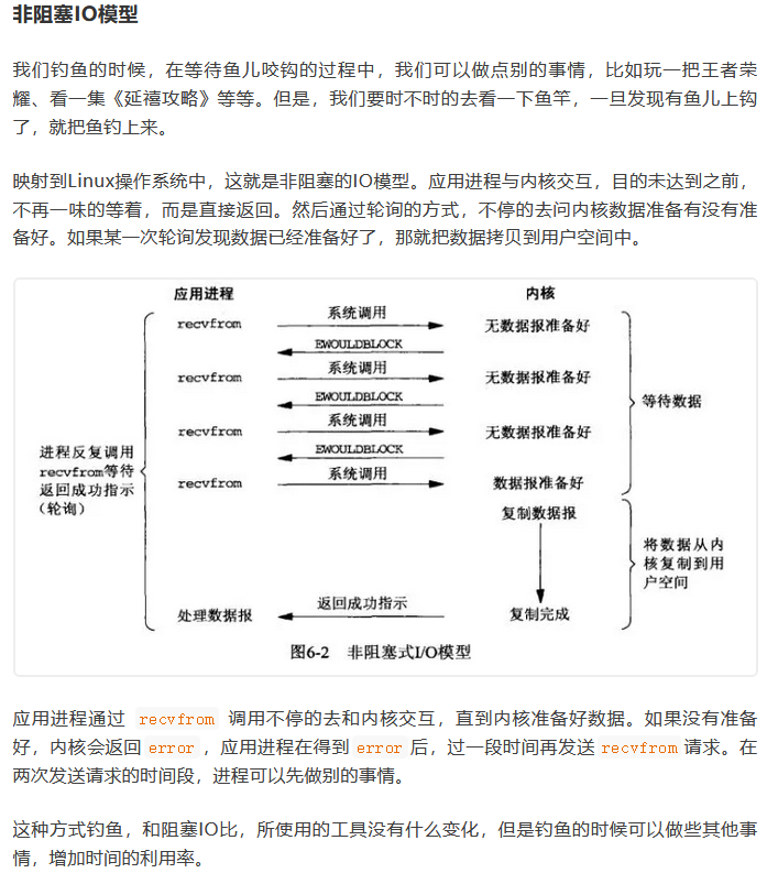 !!! 注意:从流程上来看,使用select函数进行IO请求和同步阻塞模型没有太大的区别,甚至还多了添加监视socket,以及调用select函数的额外操作,效率更差。但是,使用select以后最大的优势是用户可以在一个线程内同时处理多个socket的IO请求。用户可以注册多个socket,然后不断地调用select读取被激活的socket,即可达到在同一个线程内同时处理多个IO请求的目的。而在同步阻塞模型中,必须通过多线程的方式才能达到这个目的。