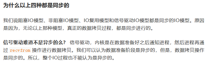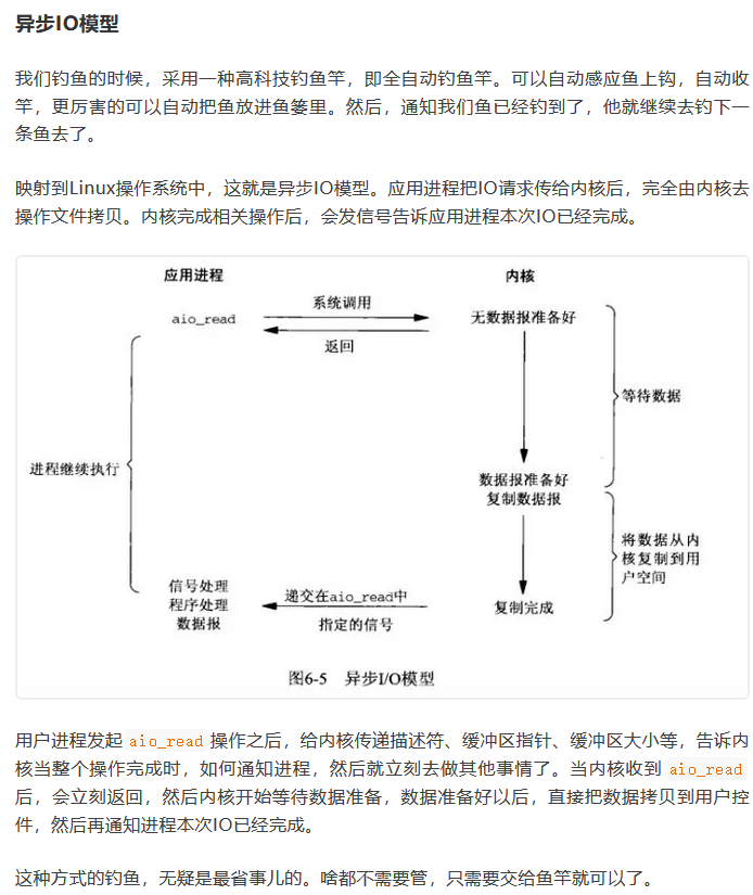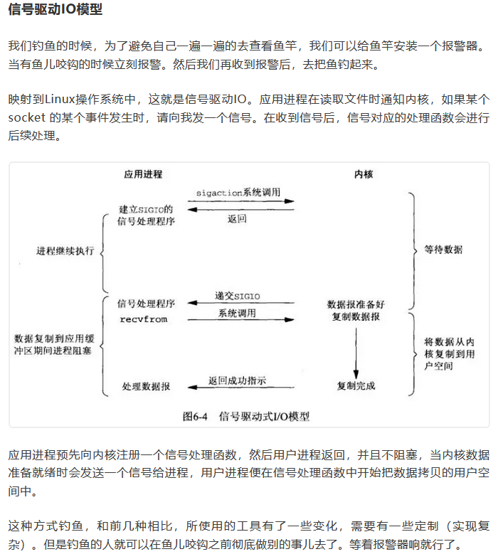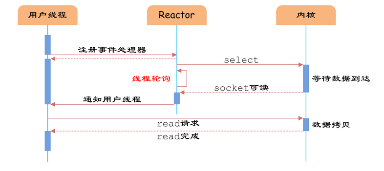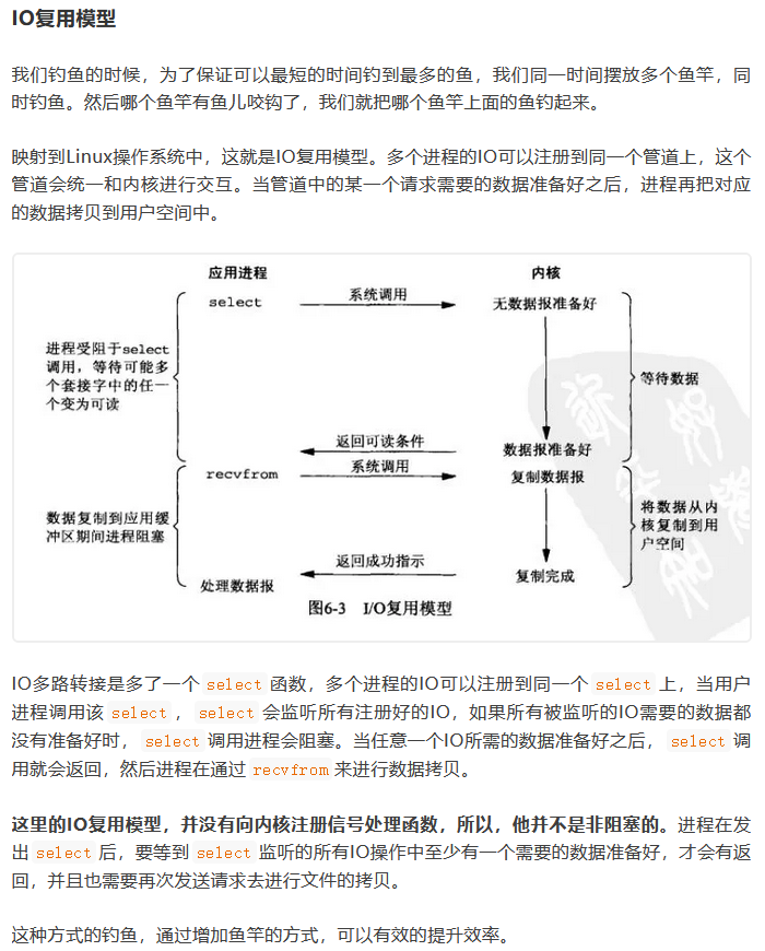IO多路复用模型使用了Reactor设计模式实现了这一机制。通过Reactor的方式,可以将用户线程轮询IO操作状态的工作统一交给handle_events事件循环进行处理。用户线程注册事件处理器之后可以继续执行做其他的工作(异步),而Reactor线程负责调用内核的select函数检查socket状态。当有socket被激活时,则通知相应的用户线程(或执行用户线程的回调函数),执行handle_event进行数据读取、处理的工作。由于select函数是阻塞的,因此多路IO复用模型也被称为异步阻塞IO模型。注意,这里的所说的阻塞是指select函数执行时线程被阻塞,而不是指socket。一般在使用IO多路复用模型时,socket都是设置为NONBLOCK的,不过这并不会产生影响,因为用户发起IO请求时,数据已经到达了,用户线程一定不会被阻塞。