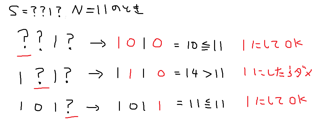 如果将最高位的 ? 设置为 1,并将其他更低位的 ? 设置为 0,可以使得当前数的十进制表示数 \(\leqslant N\) 的话,则可以将最高位的 ? 设置为 1。