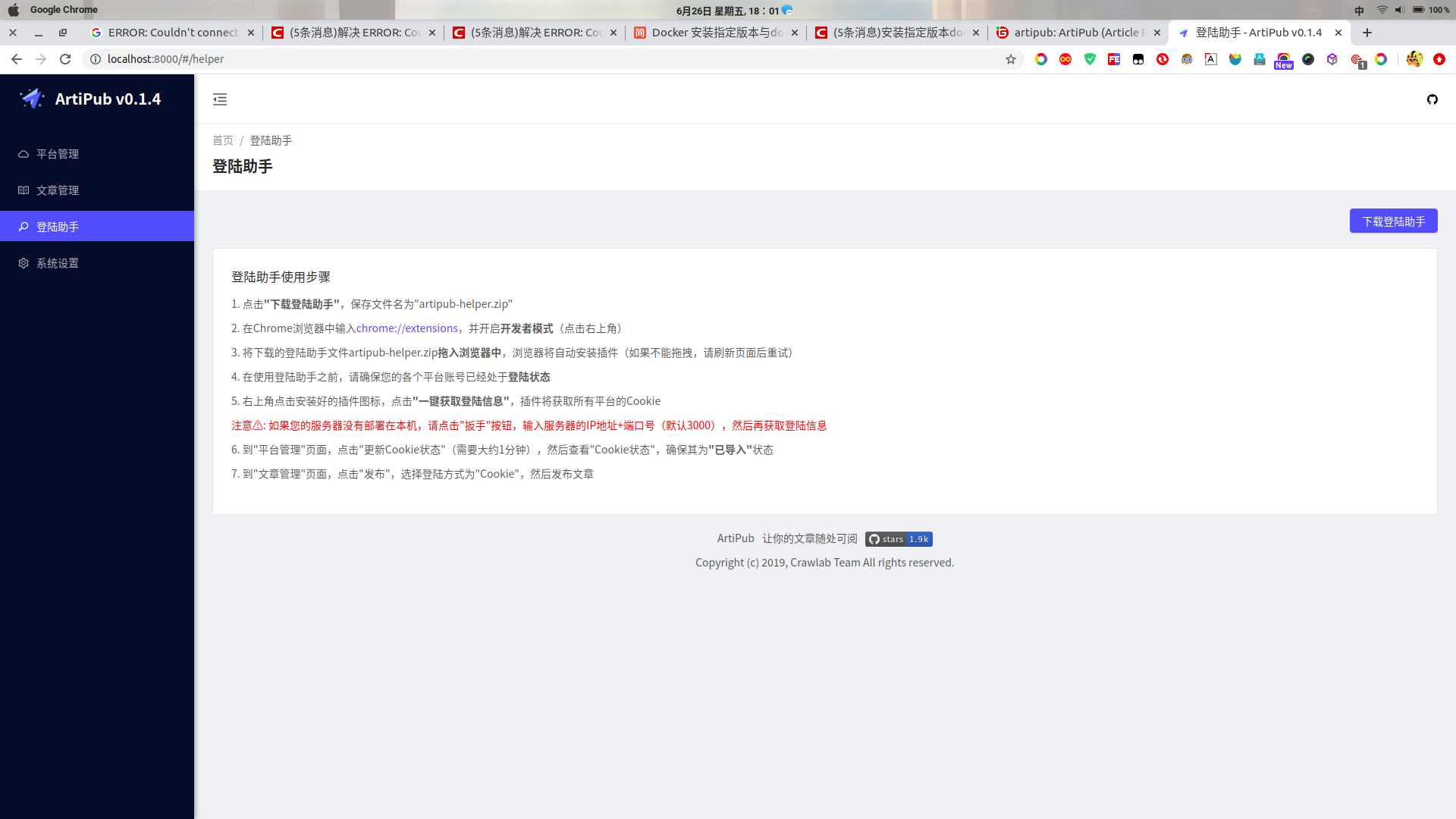 ArtiPub网上一堆安装教程,但都没法用,这是有原因(接口很很大问题,原因和后果(仅有一部分平台现可发布)看最后面~参考资料上一点)