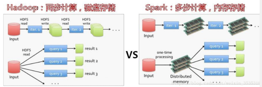 Spark 是在借鉴了 MapReduce 之上发展而来的,继承了其分布式并行计算的优点并改进了 MapReduce 明显的缺陷,差异具体如下: