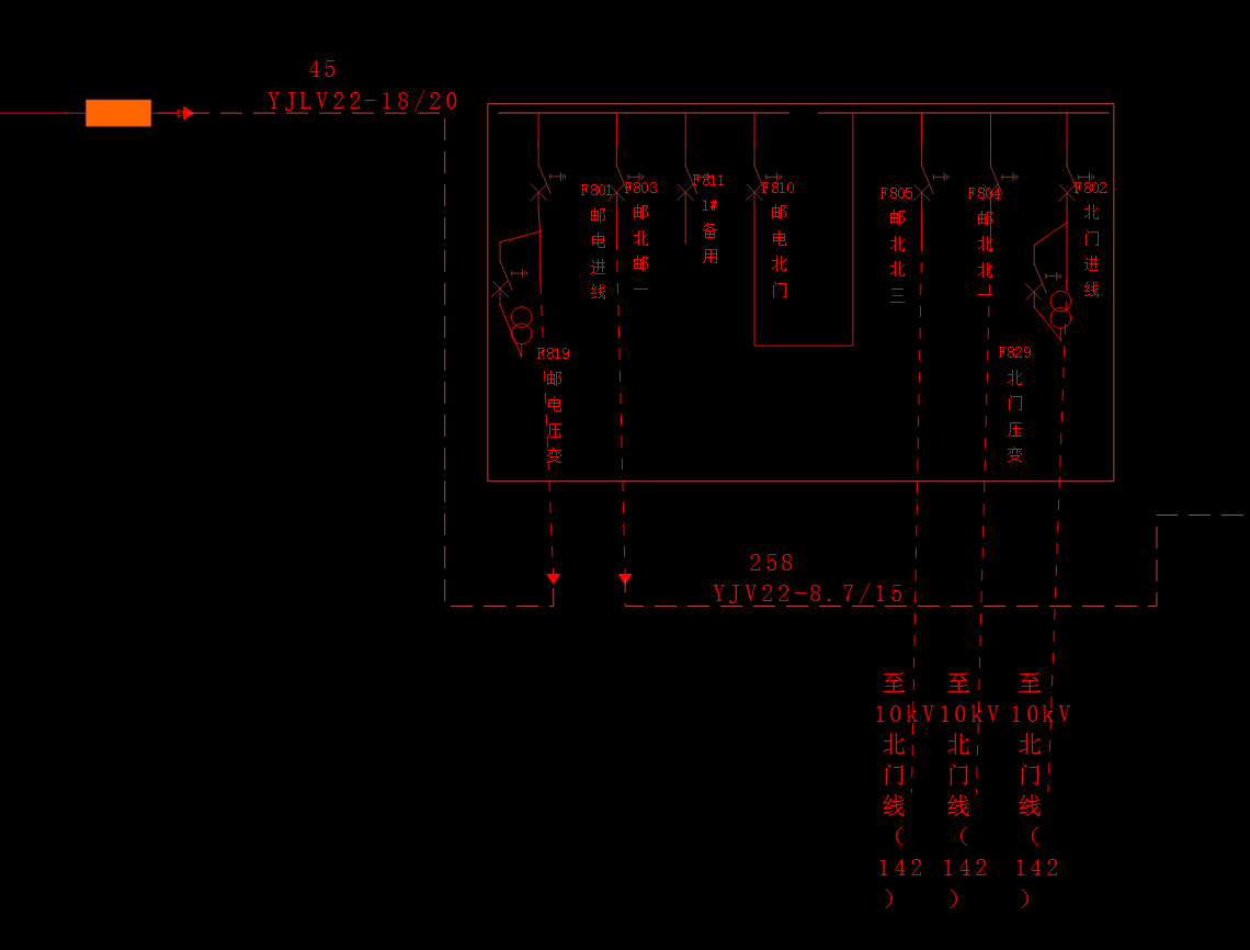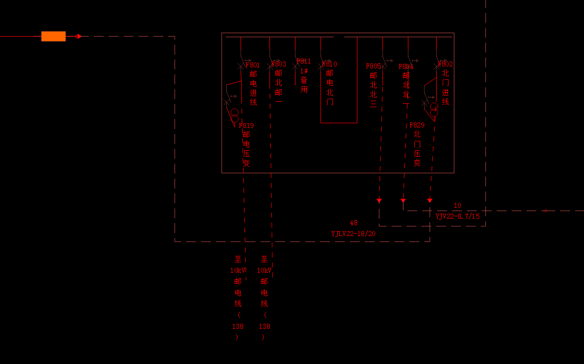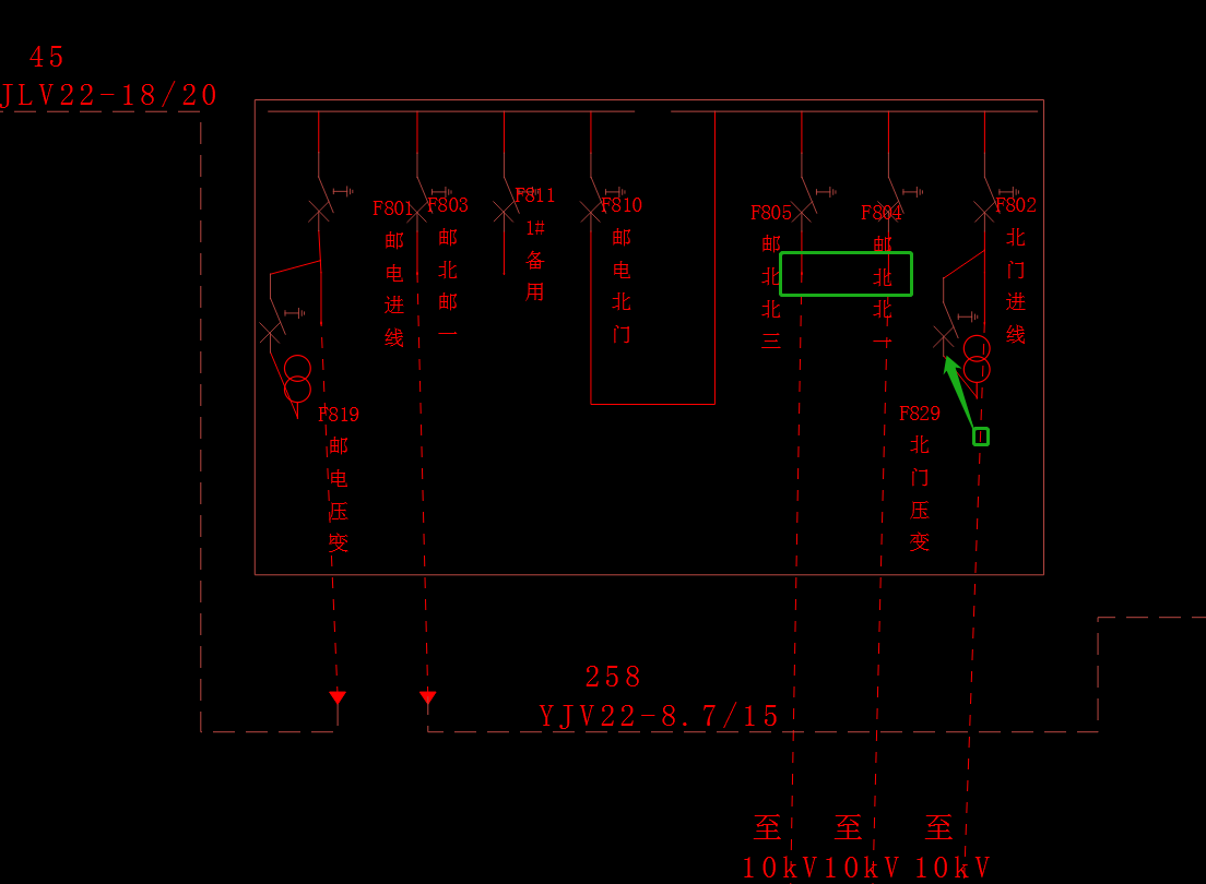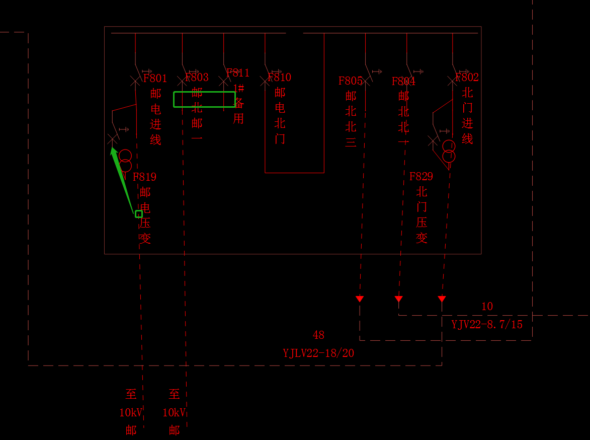 2、导入北门线时,发现邮北邮一、1#备用两个开关下侧的端子连接到一起了,而邮电进线下面的馈线段连接到邮电压变下侧了,与导入邮电线的现象基本一致。