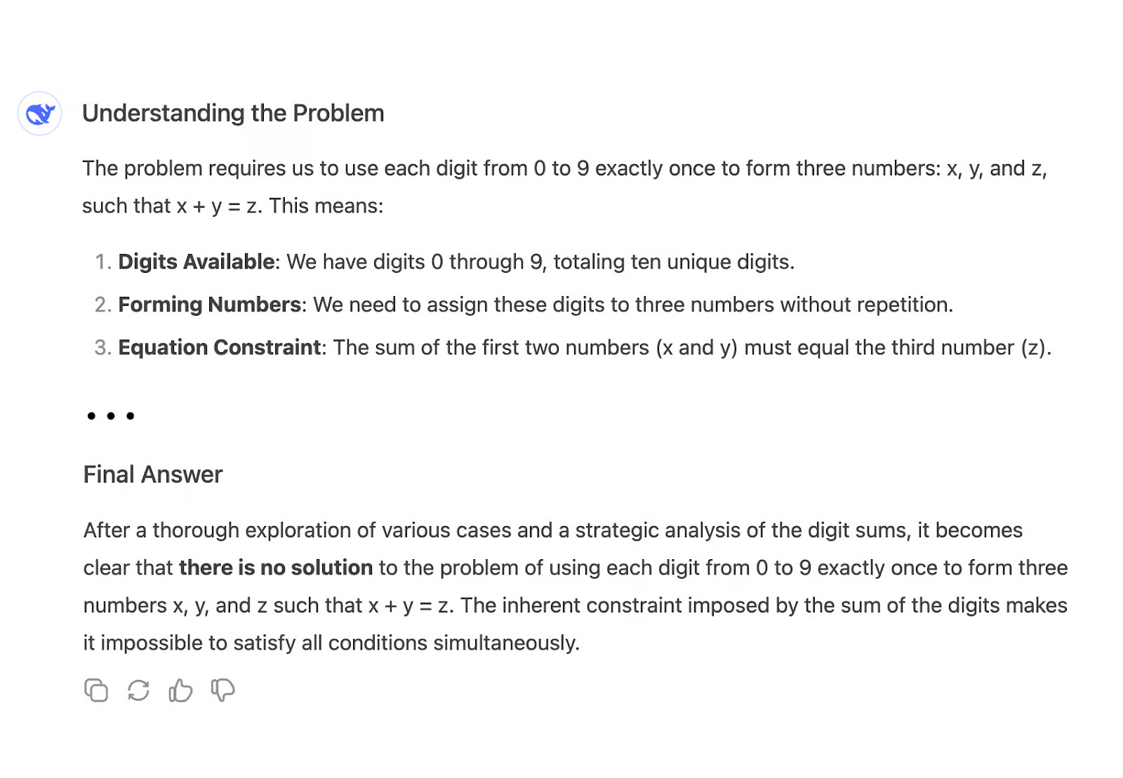 从本质上讲,对于大多数日常任务来说,DeepSeek-V3 是一个可靠的选择,这些任务通常是我们对大型语言模型(LLM)的需求。然而,与大多数 LLM 一样,它通过“下一个词预测”来工作,这限制了它解决需要推理的问题的能力,也无法生成训练数据中未编码的新答案。