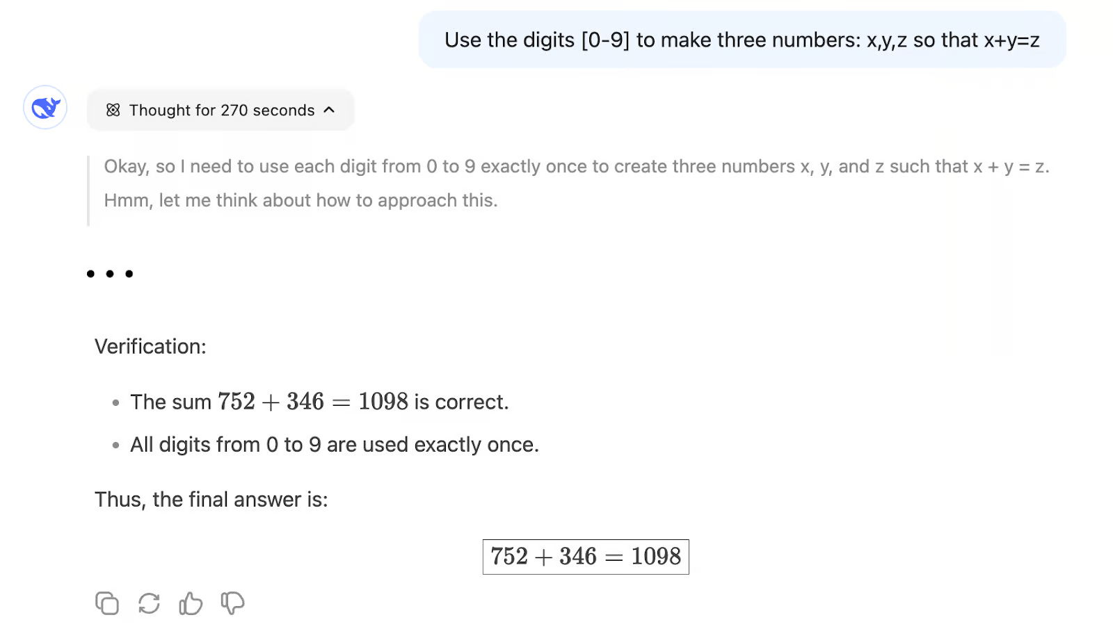 当我们向V3提出这个问题时,它立即开始生成一个冗长的答案,并最终错误地得出结论,说没有解决方案: