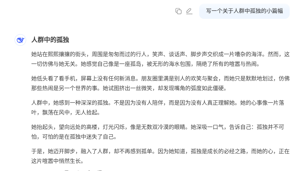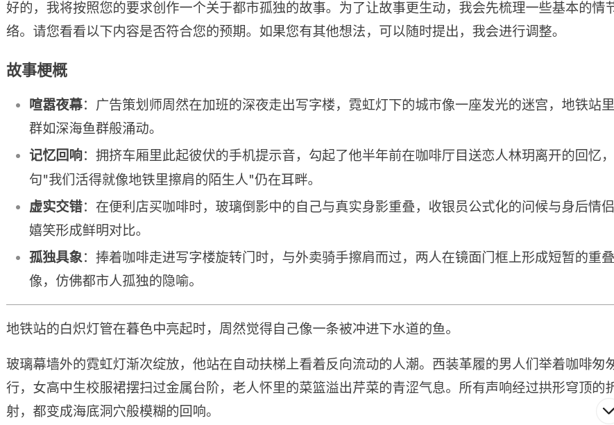 现在,让我们专注于创意写作。让我们要求这两个模型写一个有关人群中孤独的小篇幅故事。
