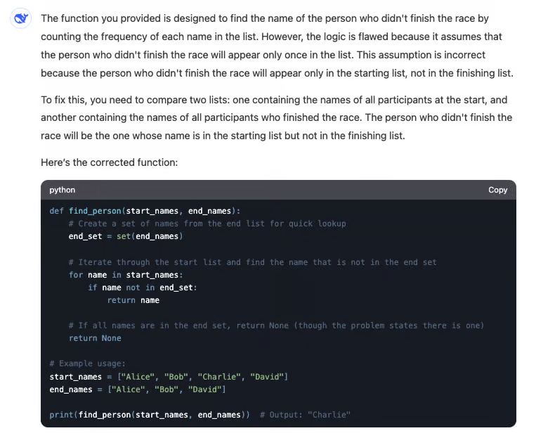 由于每个人在开始和结束比赛时都会写下自己的名字,这个代码试图通过找到只出现一次的名字来解决问题。每个完成比赛的人会写下自己的名字两次,而没有完成比赛的人只写一次。然而,这个代码错误地假设所有名字都是不同的。