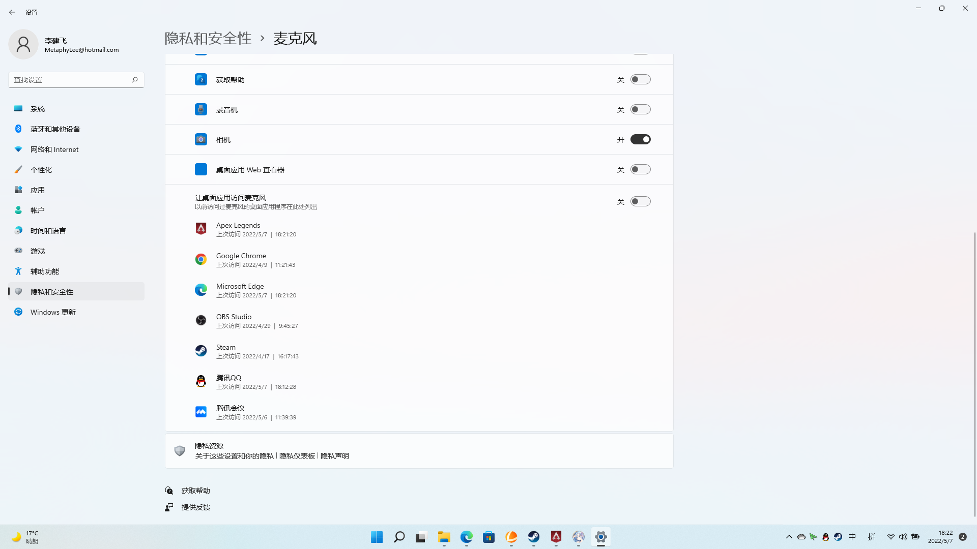 win11语音卡bug无法正常播放声音,将让桌面应用访问麦克风关闭