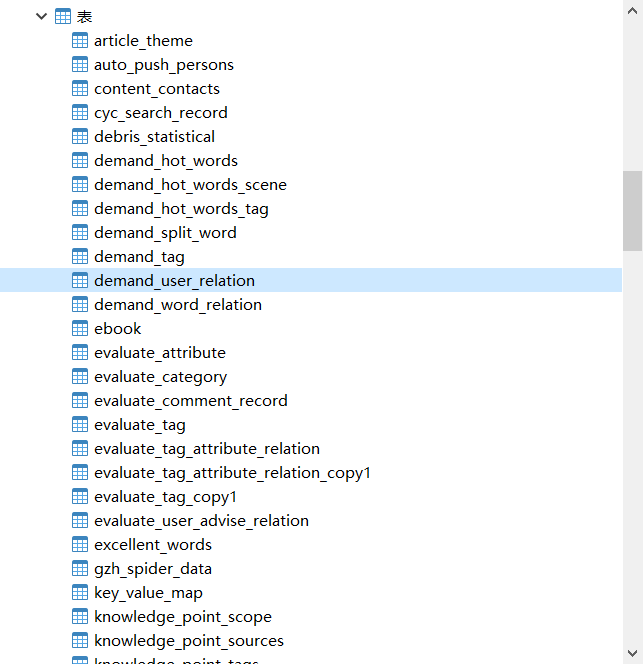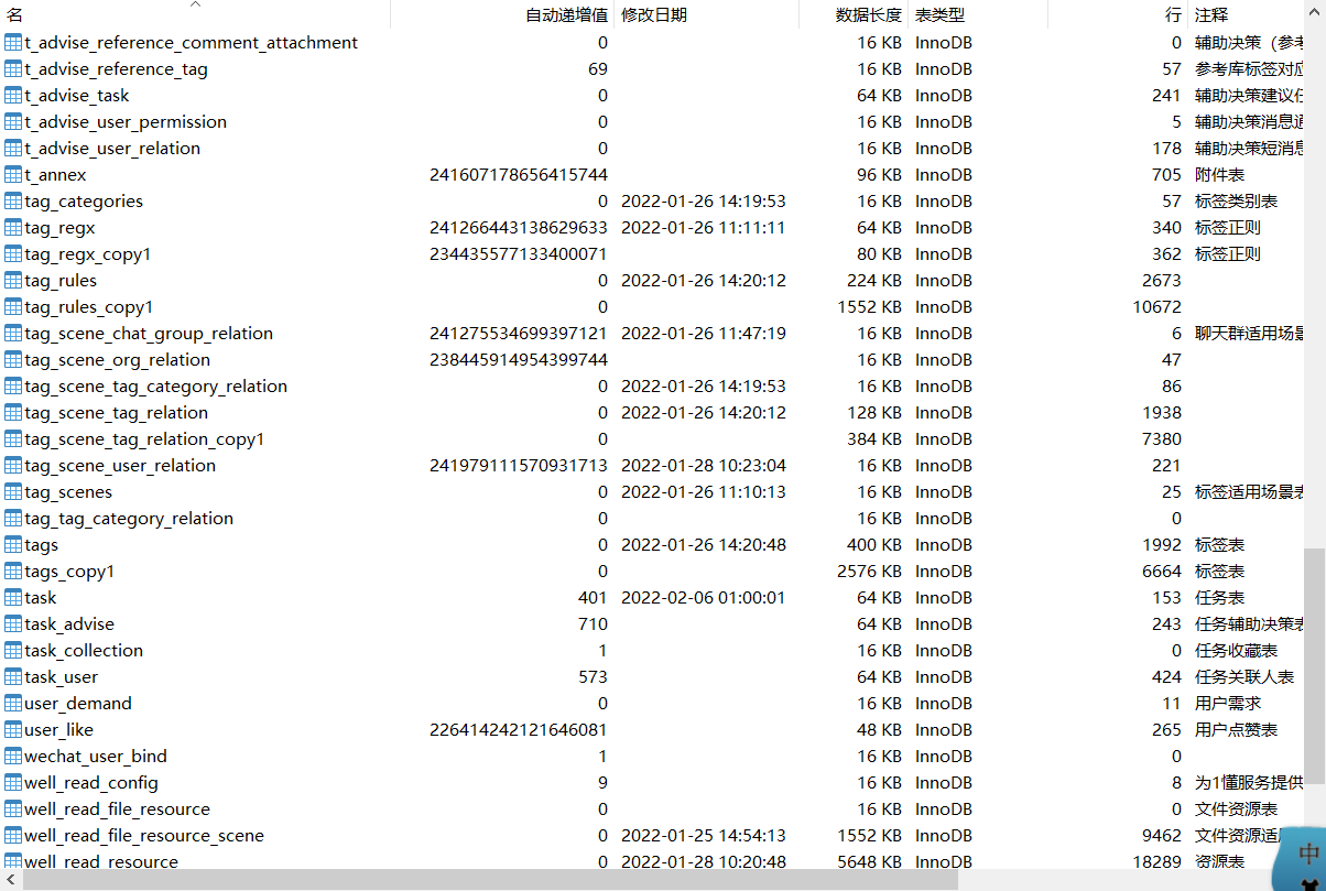 这个是部分表的截图,看出了问题所在,一部分是遵循模块化有前缀的,一部分是乱的,导致这个现象的出现应该就是多人协助开发,功能迭代过程中出现的,项目刚刚开始按模块开发大家比较遵守,后来人员的流动啊等等原因大家就放飞自我了,这个是小问题,其他的一致性其实安装阿里的java开发手册大家都遵守的话这些问题应该不会存在: