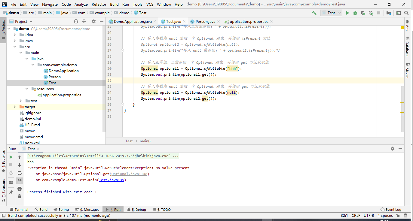 // 传入正常值,正常返回一个 Optional 对象,并使用 get 方法获取值 Optional optional1 = Optional.ofNullable("hhh"); System.out.println(optional1.get()); // 传入参数为 null 生成一个 Optional 对象,并使用 get 方法获取值 Optional optional2 = Optional.ofNullable(null); System.out.println(optional2.get());![]()