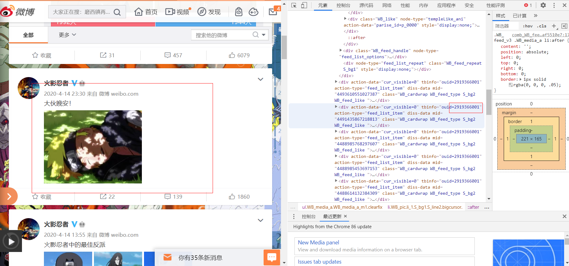 3.找一个微博试试看,看代码文档这里需要微博id,随便找一条微博,找到ouid,这里是火影忍者的微博,id是