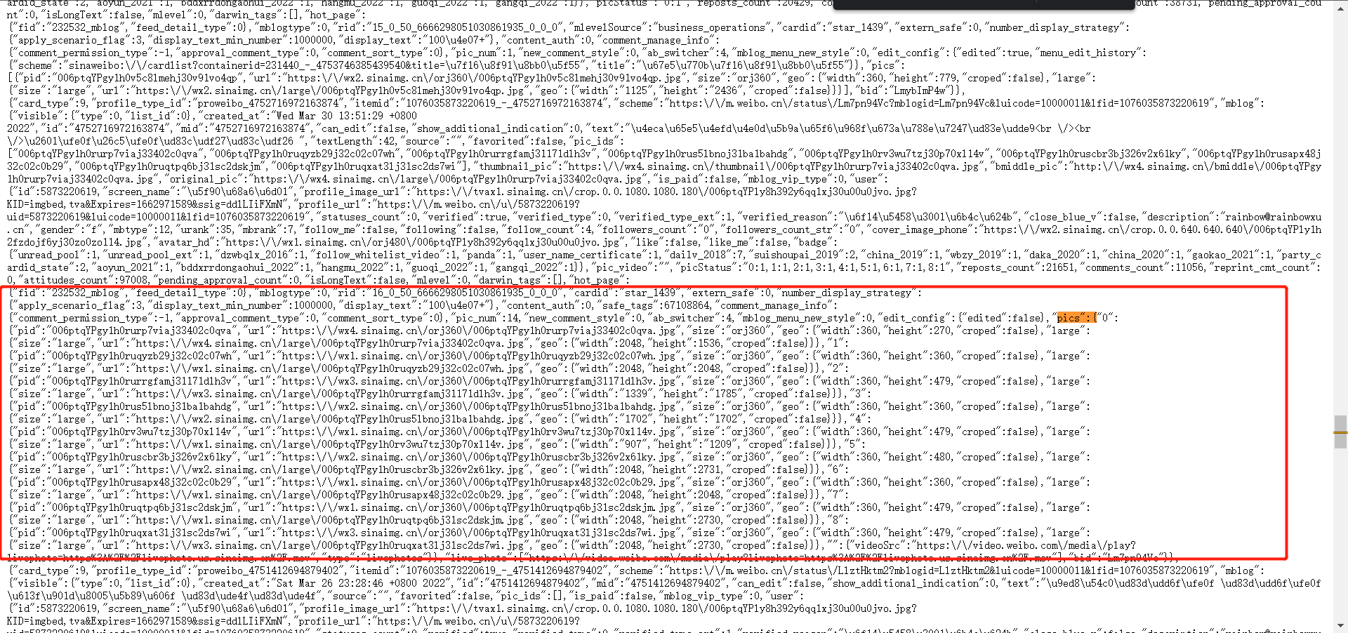 JsonArray pics = mblog.getAsJsonArray("pics");//报错位置代码,看来是对象转数组错误,我们打开链接看看。