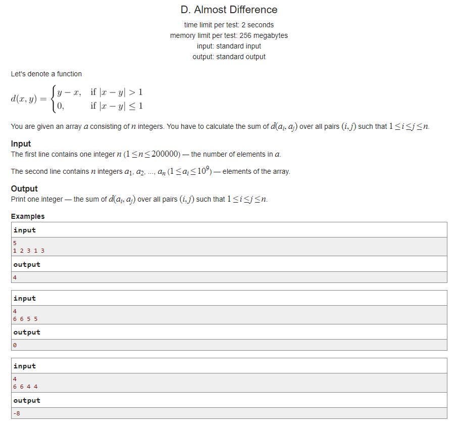 1 #define _CRT_SECURE_NO_DEPRECATE 2 #pragma comment(linker, "/STACK:102400000,102400000") 3 #include<iostream> 4 #include<cstdio> 5 #include<fstream> 6 #include<iomanip> 7 #include<algorithm> 8 #include<cmath> 9 #include<deque> 10 #include<vector> 11 #include<bitset> 12 #include<queue> 13 #include<string> 14 #include<cstring> 15 #include<map> 16 #include<stack> 17 #include<set> 18 #include<functional> 19 #define pii pair<int, ll> 20 #define mod 1000000007 21 #define mp make_pair 22 #define pi acos(-1) 23 #define eps 0.00000001 24 #define mst(a,i) memset(a,i,sizeof(a)) 25 #define all(n) n.begin(),n.end() 26 #define lson(x) ((x<<1)) 27 #define rson(x) ((x<<1)|1) 28 #define inf 0x3f3f3f3f 29 typedef long long ll; 30 typedef unsigned long long ull; 31 using namespace std; 32 const int maxn = 2e5 + 50; 33 ll ori[maxn]; 34 int n; 35 ll t[maxn]; 36 37 int Lowbit(int x) 38 { 39 return x&(-x); 40 } 41 void update(ll i, ll x) 42 { 43 while (i <= n) 44 { 45 t[i] += x; 46 i += Lowbit(i); 47 } 48 } 49 ll sum(int x) 50 { 51 ll sum = 0; 52 while (x>0) 53 { 54 sum += t[x]; 55 x -= Lowbit(x); 56 } 57 return sum; 58 } 59 60 map<ll, ll>id; 61 ll orin[maxn]; 62 set<ll>kp; 63 int main() 64 { 65 ios::sync_with_stdio(false); 66 cin.tie(0); cout.tie(0); 67 int i, j, k, m; 68 cin >> n; 69 int cnt = 1; 70 for (int i = 1; i <= n; ++i) 71 { 72 cin >> ori[i]; 73 kp.insert(ori[i]); 74 } 75 for (auto it : kp) 76 { 77 orin[cnt] = it; 78 id[it] = cnt++; 79 } 80 for (int i = 1; i <= n; ++i) 81 { 82 int iid = id[ori[i]]; 83 update(id[ori[i]], 1); 84 } 85 ll fans = 0; 86 for (int i = 1; i <= n; ++i) 87 { 88 auto it = id.lower_bound(ori[i] + 2); 89 if (it != id.end()) 90 { 91 auto ta = sum(n); 92 auto tb = sum(it->second - 1); 93 ll cnt = ta - tb; 94 fans -= cnt*ori[i]; 95 } 96 it = id.lower_bound(ori[i] - 1); 97 if (it != id.begin()) 98 { 99 it--; 100 ll ta = sum(it->second); 101 fans -= ta*ori[i]; 102 } 103 update(id[ori[i]], -1); 104 } 105 mst(t, 0); 106 for (int i = 1; i <= n; ++i) 107 { 108 int iid = id[ori[i]]; 109 update(id[ori[i]], 1); 110 } 111 112 for (int i = n; i>= 1; --i) 113 { 114 auto it = id.lower_bound(ori[i] + 2); 115 if (it != id.end()) 116 { 117 auto ta = sum(n); 118 auto tb = sum(it->second - 1); 119 ll cnt = ta - tb; 120 fans += cnt*ori[i]; 121 } 122 it = id.lower_bound(ori[i] - 1); 123 if (it != id.begin()) 124 { 125 it--; 126 ll ta = sum(it->second); 127 fans += ta*ori[i]; 128 } 129 update(id[ori[i]], -1); 130 } 131 cout << fans << endl; 132 return 0; 133 }
