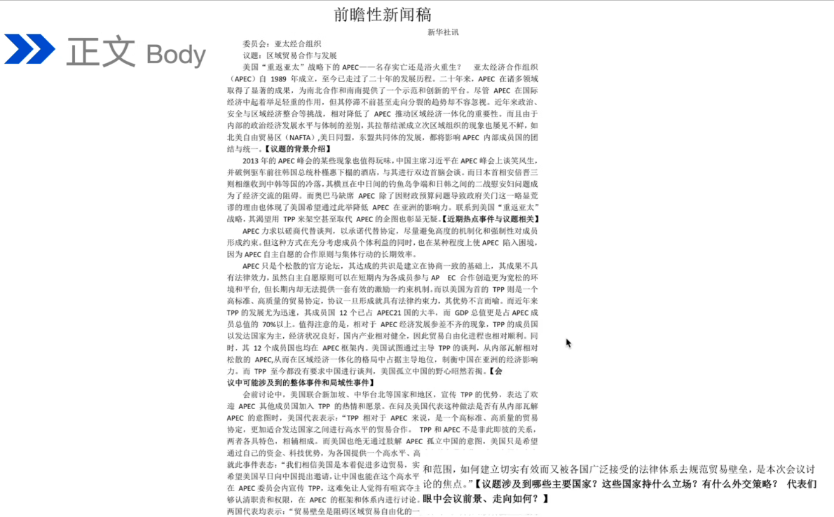 - 短评:对人和事物进行简短的评论,属于评论的一种。篇幅短小、内容单一、分析扼要等。要对自己国家立场等保持动向掌握。