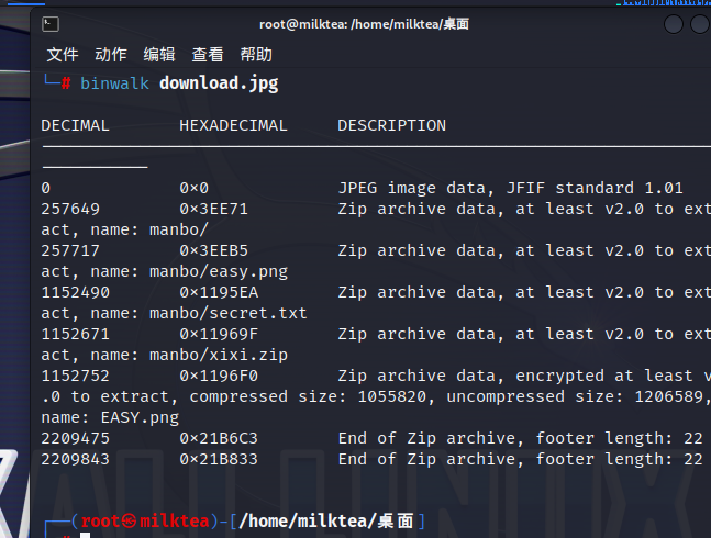 分离出来后可以得到一张图片,一个压缩包(里面也有一张图片),提示