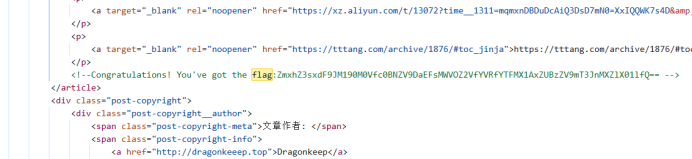 在dragonkeep师傅的博客边栏中找到web方向的题型后拉到最底下找到对应的polluted题目,在页面源码中找到flag,base64解码即可
