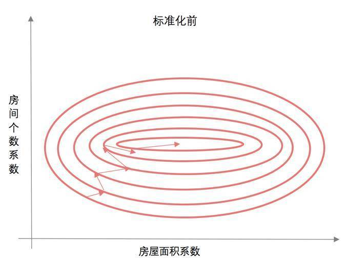 标准化前,由于变量的单位相差很大,导致了椭圆型的梯度轮廓。标准化后,把变量变成统一单位,产生了圆形轮廓。由于梯度下降是按切线方向下降,所以导致了系统在椭圆轮廓不停迂回地寻找最优解,而圆形轮廓就能轻松找到了。