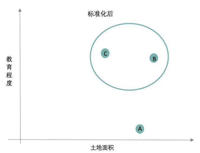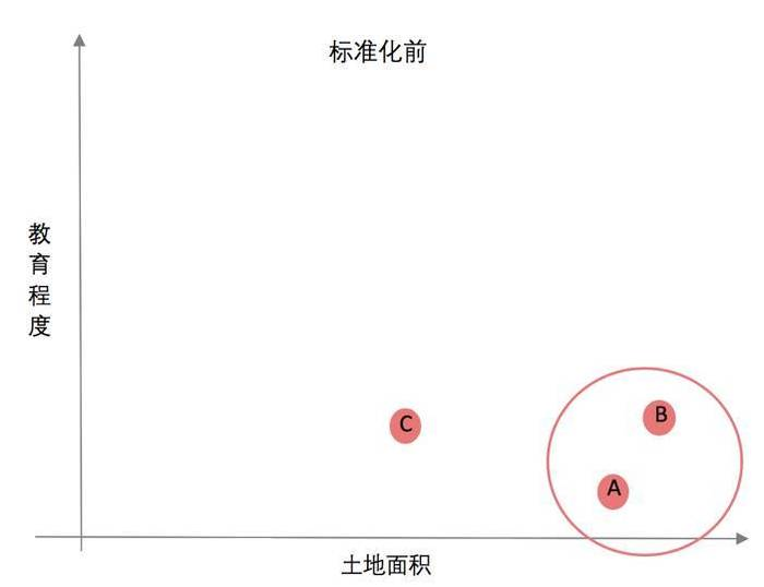 举个例子,我们将3个城市分成两类,变量有面积和教育程度占比;三个城市分别是这样的: