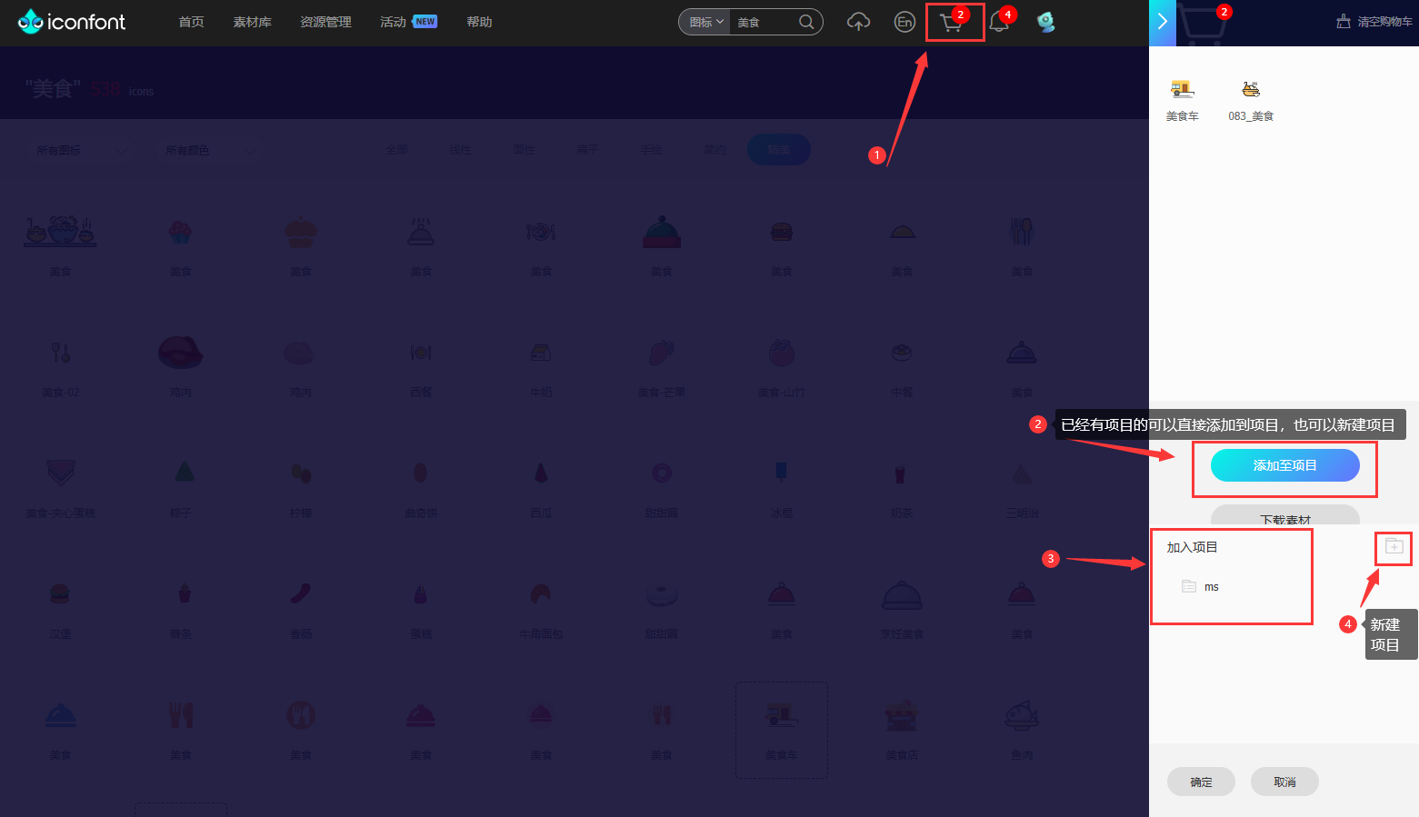 三、点击购物车可以将选择的图标加入原有项目,也可以新建项目