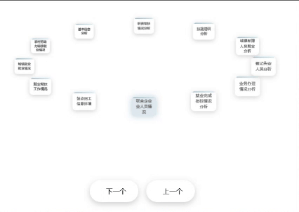 <template> <div> <div class="container"> <!-- 3D场景 --> <div class="scene"> <div class="carousel" id="carousel"> <!-- 菜单项由JavaScript动态生成 --> <div ref="menuItem" v-for="item in menuItems" class="menu-item" @mouseover="fnMouseOver()" @mouseout="fnMouseOut()" @click="fnClickUp(item)"> {{ item.title }} </div> </div> </div> <!-- <div class="indicator"> 当前选中: <span id="currentIndex">{{ this.activeIndex }}</span>/<span id="totalItems"> {{ this.menuItems.length }}</span> </div> --> <!-- 控制按钮 --> <div class="controls"> <button class="control-btn" id="rightBtn" @click="rotateNext"> <i class="fas fa-chevron-right"></i> 下一个 </button> <button class="control-btn" id="leftBtn" @click="rotatePrev"> <i class="fas fa-chevron-left"></i> 上一个 </button> </div> </div> </div> </template> <script> export default { name: "index", data() { return { menuItems: [ { title: "就业完成指标情况分析", description: "描述" }, { title: "业务办理情况分析", description: "描述" }, { title: "登记失业人员分析", description: "描述" }, { title: "城镇新增人员就业分析", description: "描述" }, { title: "技能培训分析", description: "描述" }, { title: "职资帮扶情况分析", description: "描述" }, { title: "基本信息分析", description: "描述" }, { title: "农村劳动力转移就业情况", description: "描述" }, { title: "城镇就业就业情况", description: "描述" }, { title: "就业帮扶工作情况", description: "描述" }, { title: "站点招工信息环境", description: "描述" }, { title: "联合企业业人员情况", description: "描述" } ], currentRotation: 0, activeIndex: 0, rotationStep: 0, // 每个菜单项的角度(30度) rotationDirection: 'right', // 旋转方向(right,left) timer: null, // 定时器 isRunning: true, // 控制旋转状态 } }, mounted() { this.initCarousel(); this.startTimer() }, methods: { initCarousel() { this.rotationStep = 360 / this.menuItems.length // 旋转控制变量 this.updateMenuPositions(); }, updateMenuPositions () { const radius = 300; // 旋转半径 const count = this.menuItems.length; this.$refs.menuItem.forEach((item, index) => { // 计算角度(添加偏移量实现旋转) const angle = (index / count) * Math.PI * 2 + this.currentRotation; // 计算3D位置(上下位置调换) const x = Math.sin(angle) * radius + 50; const z = Math.cos(angle) * radius + 50; const y = Math.cos(angle) * 50; // 上下调换后的垂直偏移 // 计算与观察者的距离(用于远近效果) const distance = Math.sqrt(x*x + y*y + z*z); const maxDistance = Math.sqrt(radius*radius + radius*radius); // 根据距离计算缩放比例和透明度(近大远小,近实远虚) // const scale = 0.7 + 0.5 * (1 - distance / maxDistance); const scale = 0.7 - 0.5 * (1 - distance / maxDistance); const opacity = 0.5 + 0.5 * (1 - distance / maxDistance); // 应用变换 item.style.transform = ` translate3d(0, 0, 0) translateX(${x}px) translateY(${y}px) translateZ(${z}px) scale(${scale}) `; // 应用透明度 item.style.opacity = opacity; // 激活状态处理 if (index === this.activeIndex) { item.classList.add('active'); } else { item.classList.remove('active'); } }) }, // 旋转到指定索引 rotateToIndex(index) { // 计算目标旋转角度(使该索引位于前面) const targetRotation = -index * (Math.PI * 2 / this.menuItems.length); // 应用旋转 this.currentRotation = targetRotation; this.activeIndex = index; this.updateMenuPositions(); }, // 旋转到下一个项目 rotateNext() { this.activeIndex = (this.activeIndex + 1) % this.menuItems.length; this.rotateToIndex(this.activeIndex); }, // 旋转到上一个项目 rotatePrev() { this.activeIndex = (this.activeIndex - 1 + this.menuItems.length) % this.menuItems.length; this.rotateToIndex(this.activeIndex); }, fnMouseOver() { this.isRunning = false; }, fnMouseOut() { this.isRunning = true; }, fnClickUp (item) { }, startTimer() { this.timer = setInterval(() => { if(!this.isRunning) return if (this.rotationDirection === 'right') { this.rotatePrev(); } else { this.rotateNext(); } }, 2000); }, pauseTimer() { this.isRunning = false; clearInterval(this.timer); this.timer = null; } } } </script> <style scoped> .container { position: relative; top: 8rem; width: 100%; max-width: 1200px; text-align: center; padding: 20px; z-index: 10; } /* 3D场景容器 */ .scene { width: 500px; height: 300px; margin: 0 auto 50px; position: relative; transform-style: preserve-3d; } .carousel { width: 100%; height: 100%; position: relative; transform-style: preserve-3d; transform: rotateX(-10deg); /* 上下翻转 */ transition: transform 0.8s cubic-bezier(0.25, 0.1, 0.25, 1); } /* 菜单项样式 */ .menu-item { position: absolute; width: 100px; height: 80px; background: rgba(255, 255, 255, 0.1); border-radius: 15px; display: flex; flex-direction: column; justify-content: center; align-items: center; color: #000; font-weight: bold; box-shadow: 0 5px 20px rgba(0, 0, 0, 0.3); cursor: pointer; transition: all 0.5s ease; transform-origin: center center; transform-style: preserve-3d; backdrop-filter: blur(8px); border: 1px solid rgba(255, 255, 255, 0.15); overflow: hidden; text-align: center; padding: 15px; font-size: 16px; line-height: 1.4; } .menu-item::before { content: ''; position: absolute; top: 0; left: 0; width: 100%; height: 4px; background: linear-gradient(90deg, #457b9d, #a8dadc); } /* 悬停效果 */ .menu-item:hover { background: rgba(168, 218, 220, 0.2); box-shadow: 0 8px 25px rgba(69, 123, 157, 0.5); } /* 选中项效果 */ .menu-item.active { background: rgba(69, 123, 157, 0.3); box-shadow: 0 0 25px rgba(69, 123, 157, 0.6); border: 1px solid rgba(168, 218, 220, 0.5); transform: translateZ(20px) scale(1.05); } /* 控制按钮容器 */ .controls { display: flex; justify-content: center; gap: 20px; margin-top: 30px; flex-wrap: wrap; } /* 控制按钮样式 */ .control-btn { padding: 14px 30px; background: rgba(255, 255, 255, 0.1); border: 1px solid rgba(25