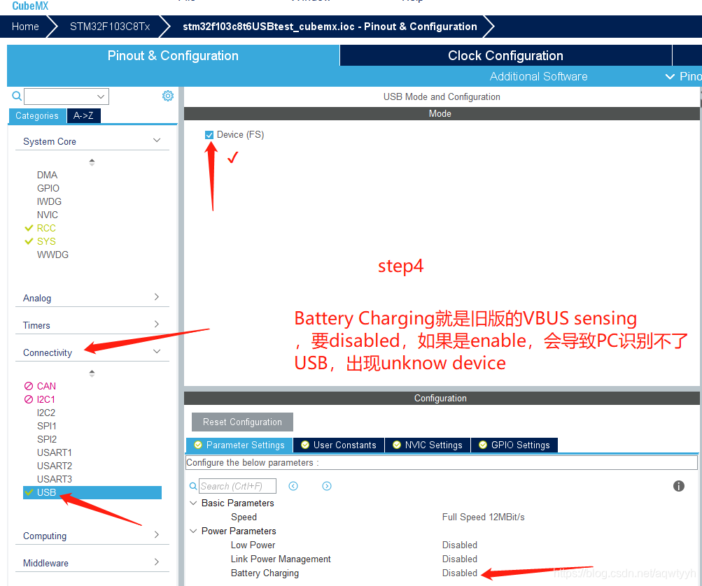 注意: Battery Charging就是旧版的VBUS sensing,如果是enablePC会识别不了USB虚拟口,出现unknow device。
