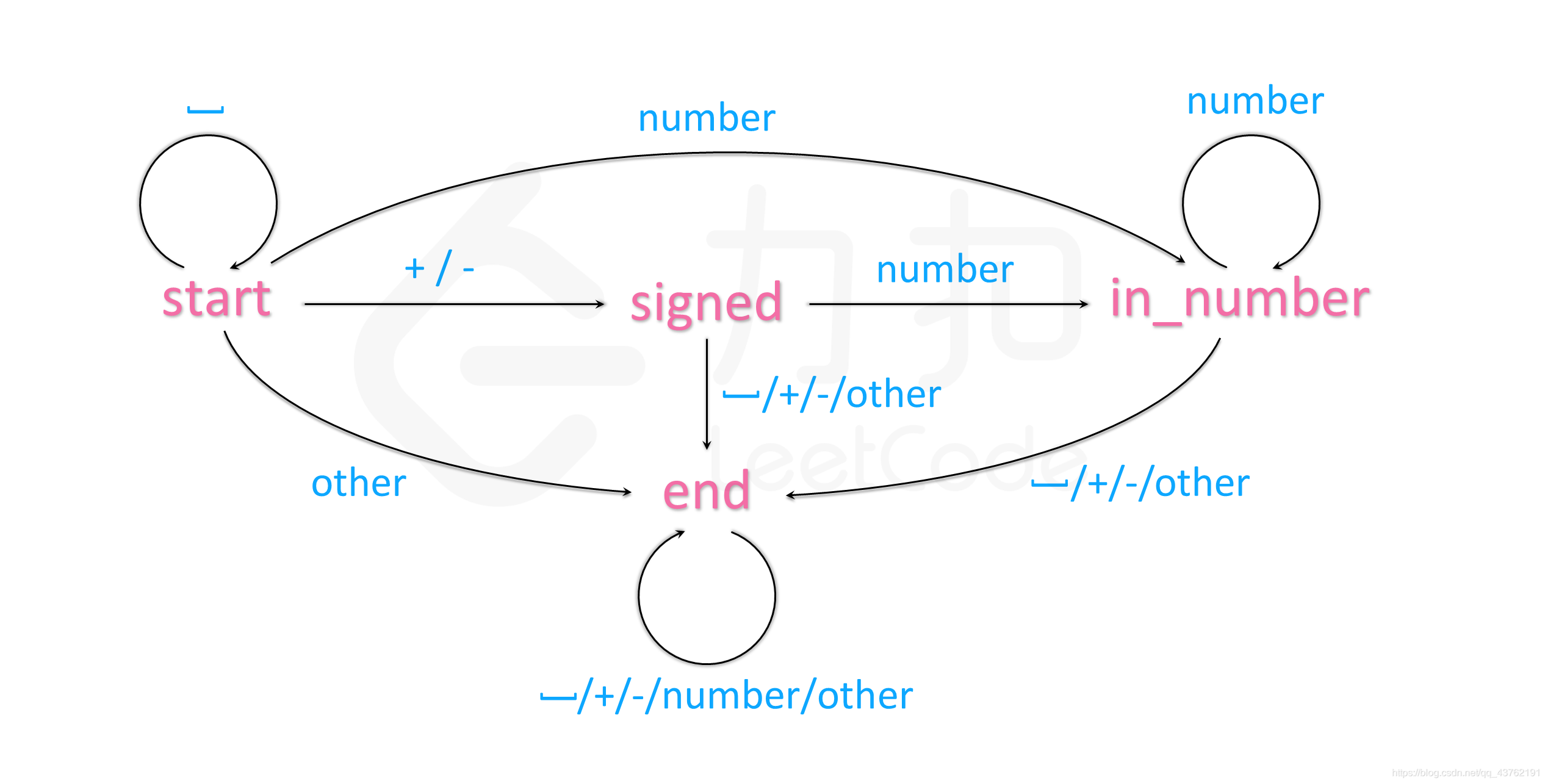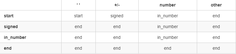 下表中第一栏是输入,第一列是状态。其他部分就是特定状态下,遇到特定输入,会触发什么状态。当状态为in_number的时代表可计数,为signed的时代表是符号,为end的时代表结束。
