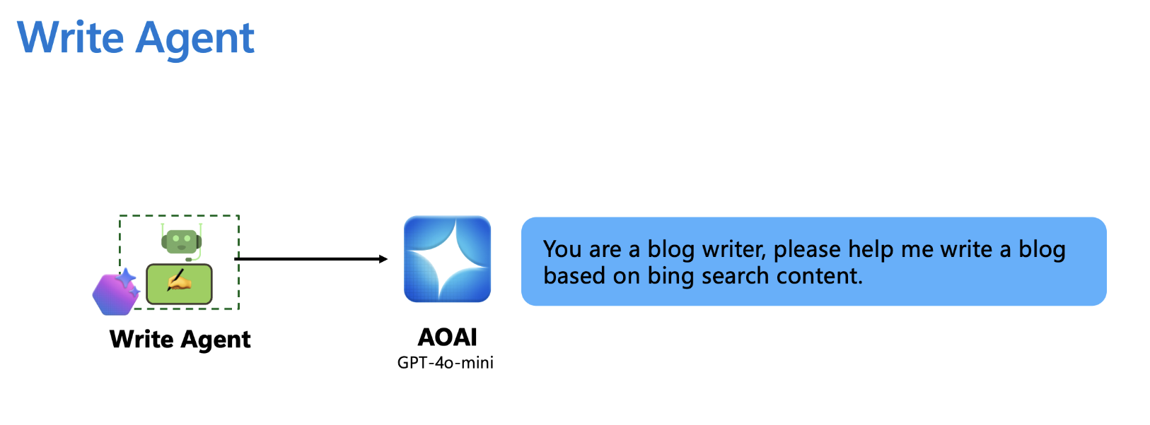 下⾯介绍⼀个场景,如⼀个 Blog 创作场景,我们可以围绕该创作场景定义三个 AI Agent Service 服务:内容搜集的 Agent、编写技能的 Agent、以及保存内容功能的 Agent,然后通过 AutoGen / Semantic Kernel 对 AI Agent 进⾏编排。