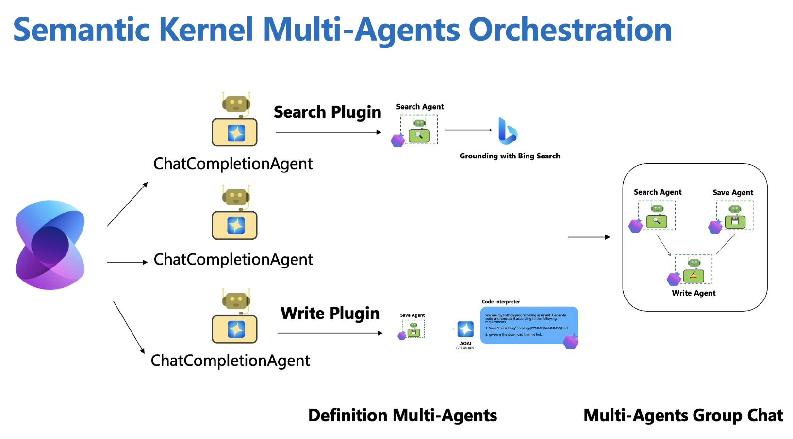 在企业场景中,我们拥有不同的单智能体,可以协助我们完成不同的工作,同时,基于不同任务又可以组合不同的智能体来完成相关⼯作。如需要发送 Blog,我们可以将上述的三个智能体进⾏组合来完成任务。AutoGen / Semantic Kernel 都支持智能体的编排⼯作,我们可以利⽤ AutoGen 中的 Function Calling / Semantic Kerenl Plugin 进行 Azure AI Agent Service 的绑定来完成上述三个智能体的编排⼯作。