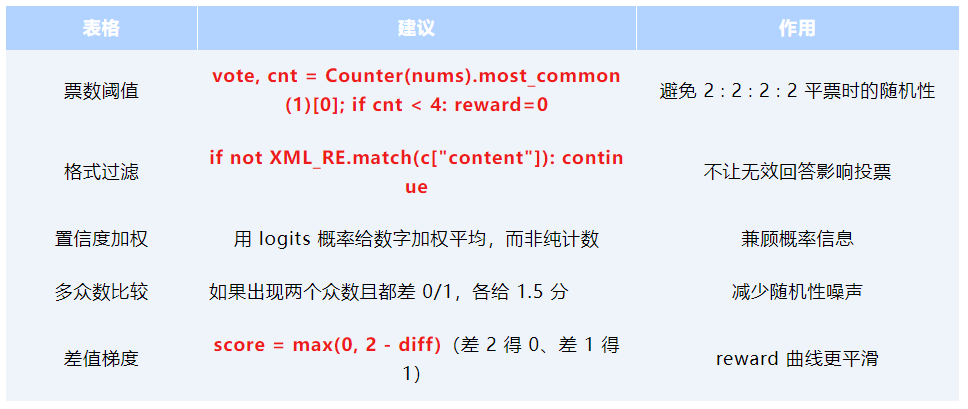 4、格式门控 + 数值投票分离 先用格式奖励约束输出形状,再用投票奖励评数值;两部分可独立调 权重,互不干扰。
