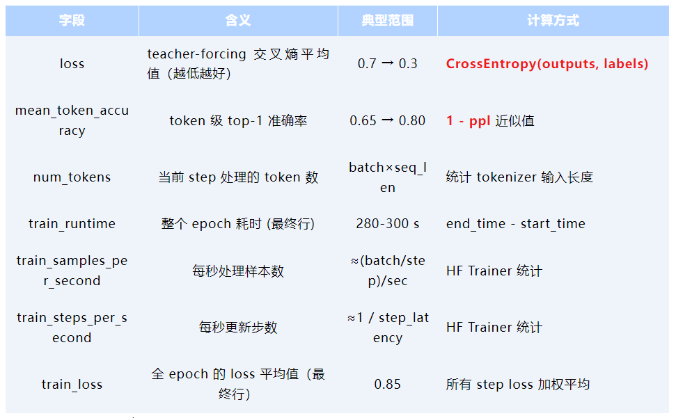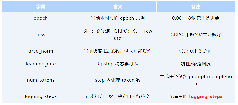 fmt_reward/mean≥ 0.9 → 模板输出稳定。cor_reward/mean≥ 1.2 → 30 % 以上完全正确(好)。kl< 0.3 → 更新稳定;若突涨,需减小学习率 / β。frac_reward_zero_std< 0.3 → 奖励信号足够密集。completions/clipped_ratio> 0.4 → 说明 128 token 不够,可调大。