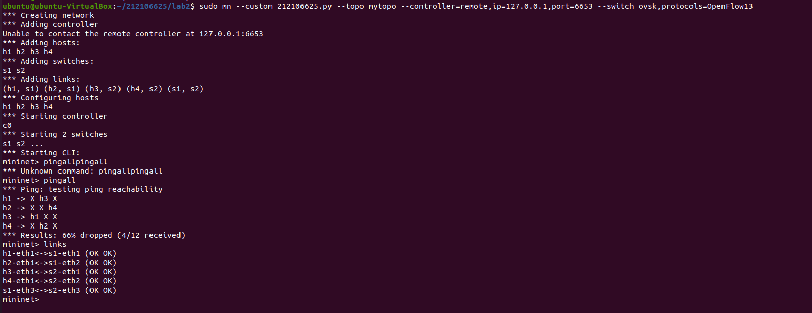 b) /home/用户名/学号/lab2/目录下开启Mininet CLI并执行pingall命令的截图、上述目录下查看OVS流表的命令结果截图,wireshark抓包截图