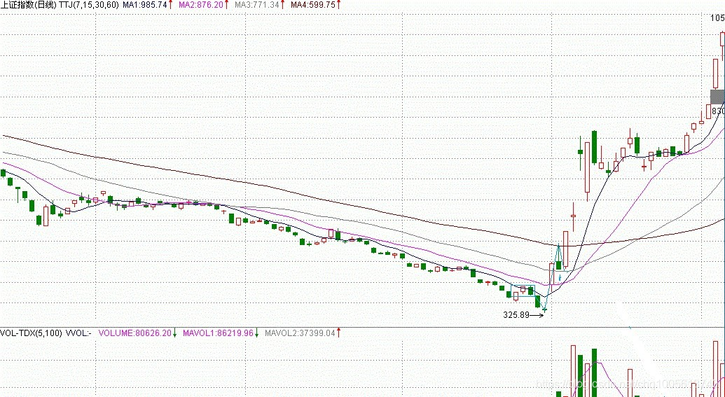 显然,第一类买点与第二类买点是前后出现的,不可能产生重合,而第一类与第三类买点,一个在中枢之下、一个在中枢之上,也不可能产生重合。只有第二类买点与第三类买点是可能产生重合的,这种情况就是:当第一类买点出现后,一个次级别的走势凌厉地直接上破前面下跌的最后一个中枢,然后在其上产生一个次级别的回抽不触及该中枢,这时候,就会出现第二类买点与第三类买点重合的情况,也只有这种情况才会出现两者的重合。当然,在理论上没有任何必然的理由确定第二、三类买点重合后一定不会只构成一个更大级别的中枢扩张,但实际上,一旦出现这种情况,一个大级别的上涨往往就会出现。一个最典型的例子,就是大盘在94年7月底部跌到325点后,8月1日跳空高开,5分钟上形成单边上涨突破前面的30分钟中枢,第二天大幅上冲后突然大幅回洗形成5分钟的走势级别的回抽,那时候最高已经摸到快500点,一天半上涨50%,又半天回跌15%,这样的回抽,一般来说是很恐怖的,但如果明白第二类买点与第三类买点的重合道理,就知道这是最好的补进机会,结果第三天又开始单边上扬,第六天达到750点。这是指数上最典型的一个例子了。而且,325点留下的缺口至今未补,中国几十年的一个大牛市,从指数上看,这是一个最重要的缺口了,将支持中国股市几十年甚至上百年的大牛市。