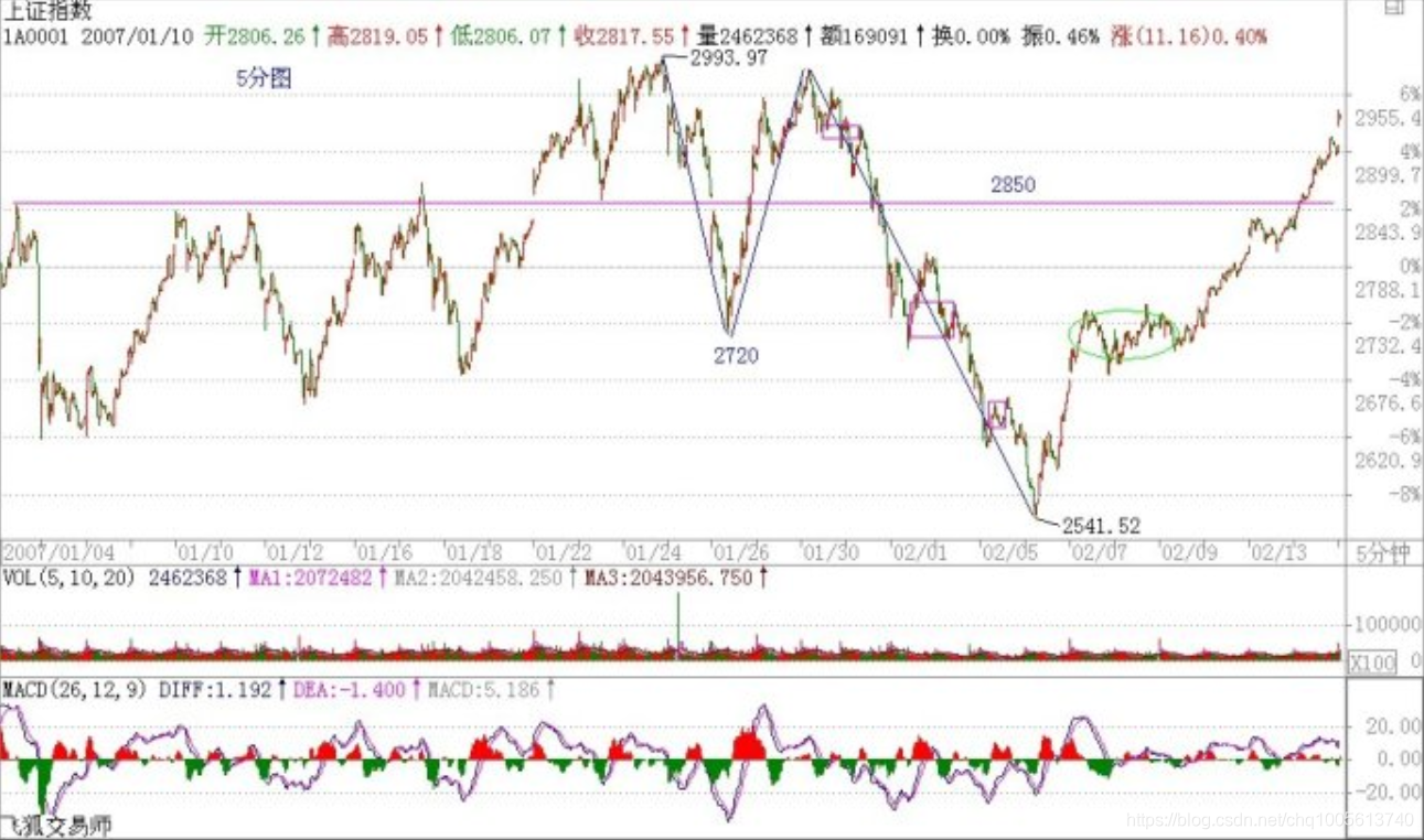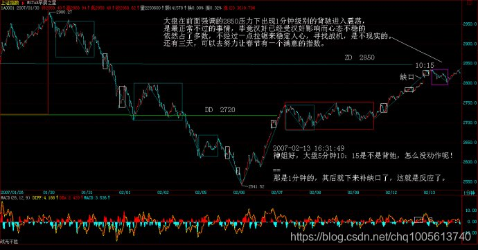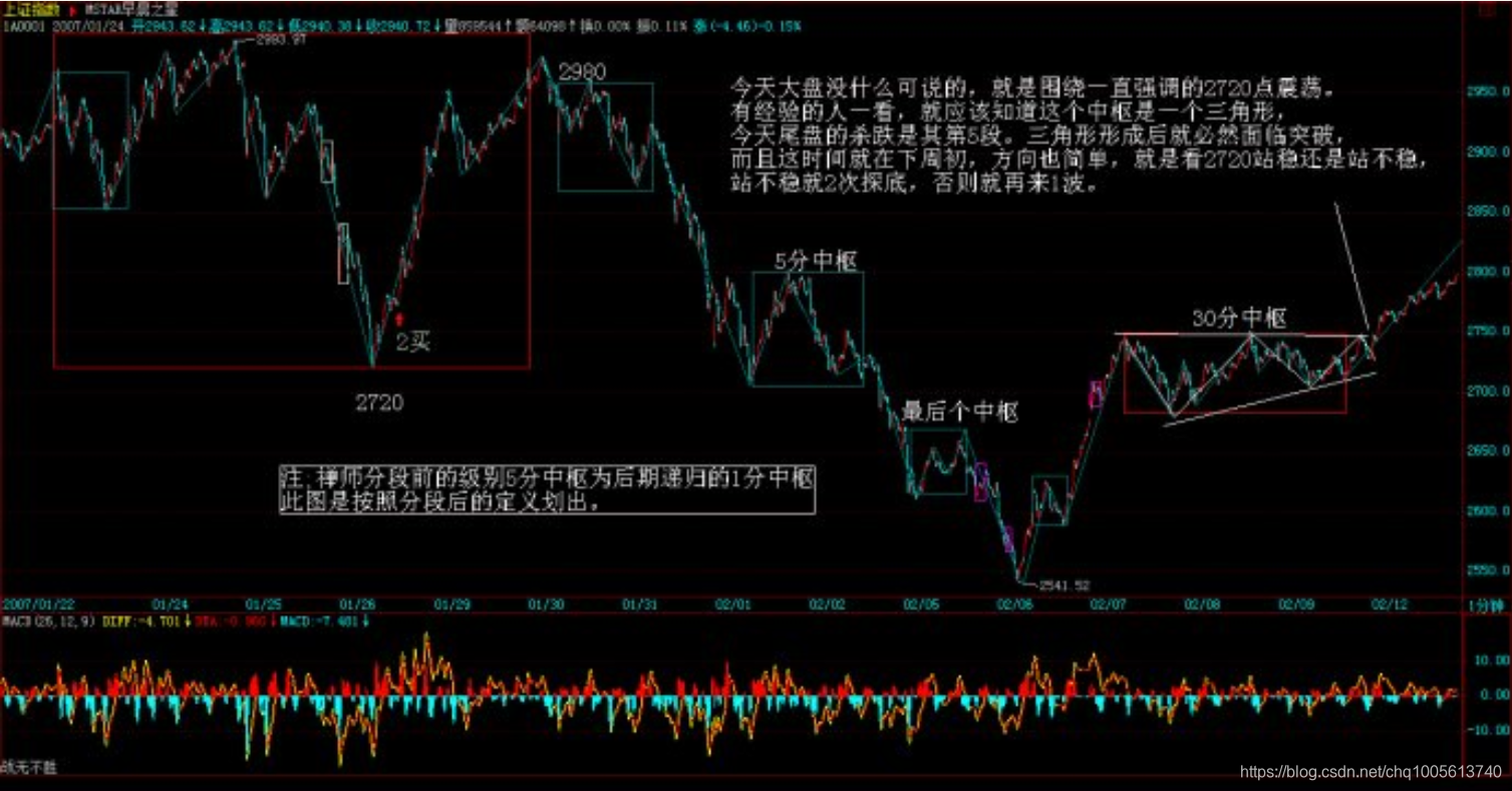 例如,这次20070206的反弹,用5分钟背驰段,然后考察1分钟以及1分钟以下级别的背驰进行精确定位,可以极为精确地把握这个底部,而且在实践中,很多人按照本ID的理论都把握住了,那么,其后的反弹,第一波是1分钟走势马上回到从2980开始的5分钟下跌的最后一个中枢里,这样就意味着第一种最弱的情况可能性可以完全排除了,其后,1分钟的走势继续完成,扩展成一个5分钟的上涨,在20070207的11点前后,一个1分钟的背驰制造了上涨的结束,其后进入一个中枢的震荡中,这个中枢,按照本章的定理,就可以断言,至少是5分钟级别的,而实际上演化成一个30分钟级别的,这意味着,一个快速的5分钟上涨的可能就没有了,后面只有两种演化的可能,就是一个30分钟以上级别的盘整,或者是一个30分钟以上的上涨,至于哪种情况,就必须看后面走势的演化。