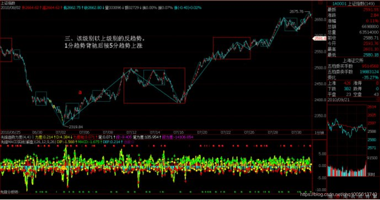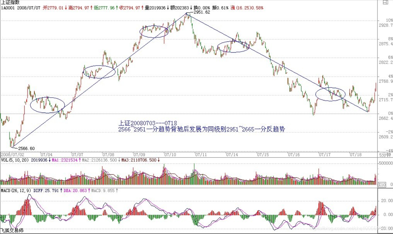 该定理的证明有点抽象,估计大多数的人都没兴趣,那就用一个例子来说明,也大致知道证明的轮廓,更重要的是,这样,各位对走势的形成有一个更深切的认识。例如,一个5分钟背驰段的下跌,最终通过1分钟以及1分钟以下级别的精确定位,最终可以找到背驰的精确点,其后就发生反弹。注意,反弹只是一般的术语,在本ID的理论中,对这反弹会有一个很明确的界定,就是包括三种情况:一、该趋势最后一个中枢的级别扩展、二、该级别更大级别的盘整、三该级别以上级别的反趋势。