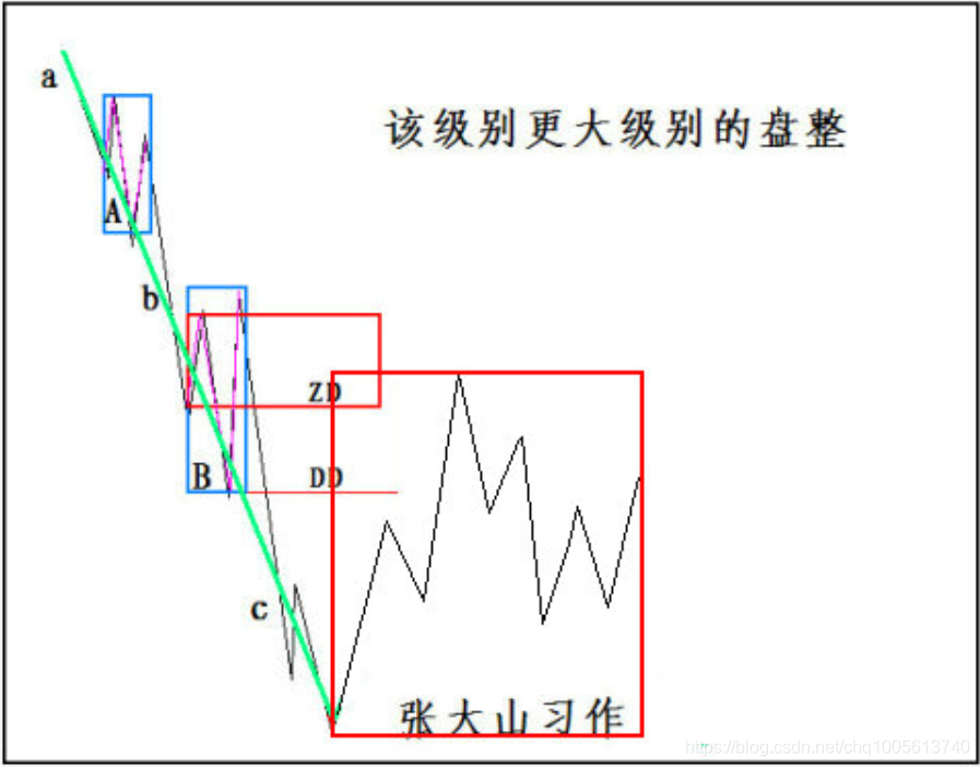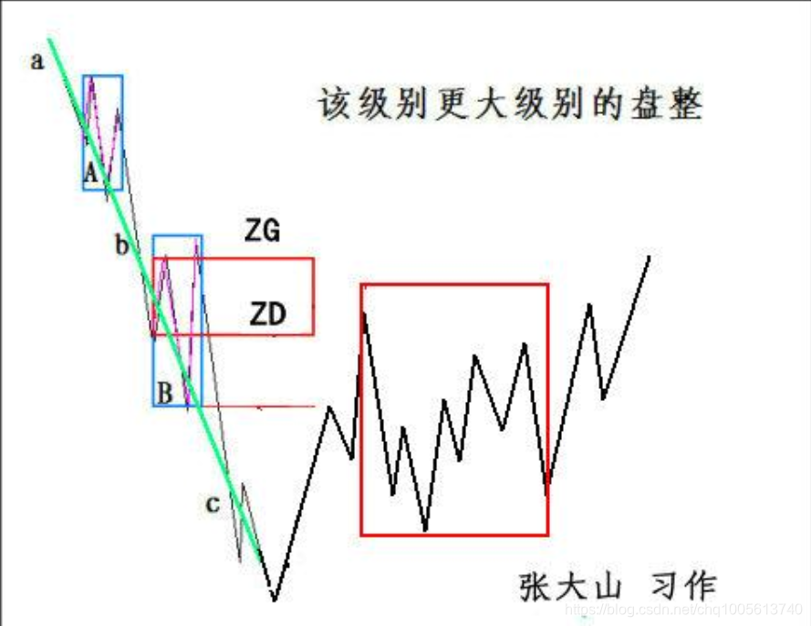 有人总是搞不明白为什么“下跌+盘整”中盘整的中枢级别一定大于下跌中的中枢,这里不妨用一个例子说明一下:例如,还是一个5分钟的下跌,那至少有两个中枢,整个下跌,最一般的情况就是a+A+b+B+c,其中的a\b\c,其级别最多就是1分钟级别的,甚至最极端的情况,可以就是一个缺口。而A、B,由于是5分钟级别的中枢,那至少由3段1分钟的走势类型构成,如果都按1分钟级别的走势类型来计量,而且不妨假设a\b\c都是1分钟的走势类型,那么a+A+b+B+c就有9个1分钟的走势类型。