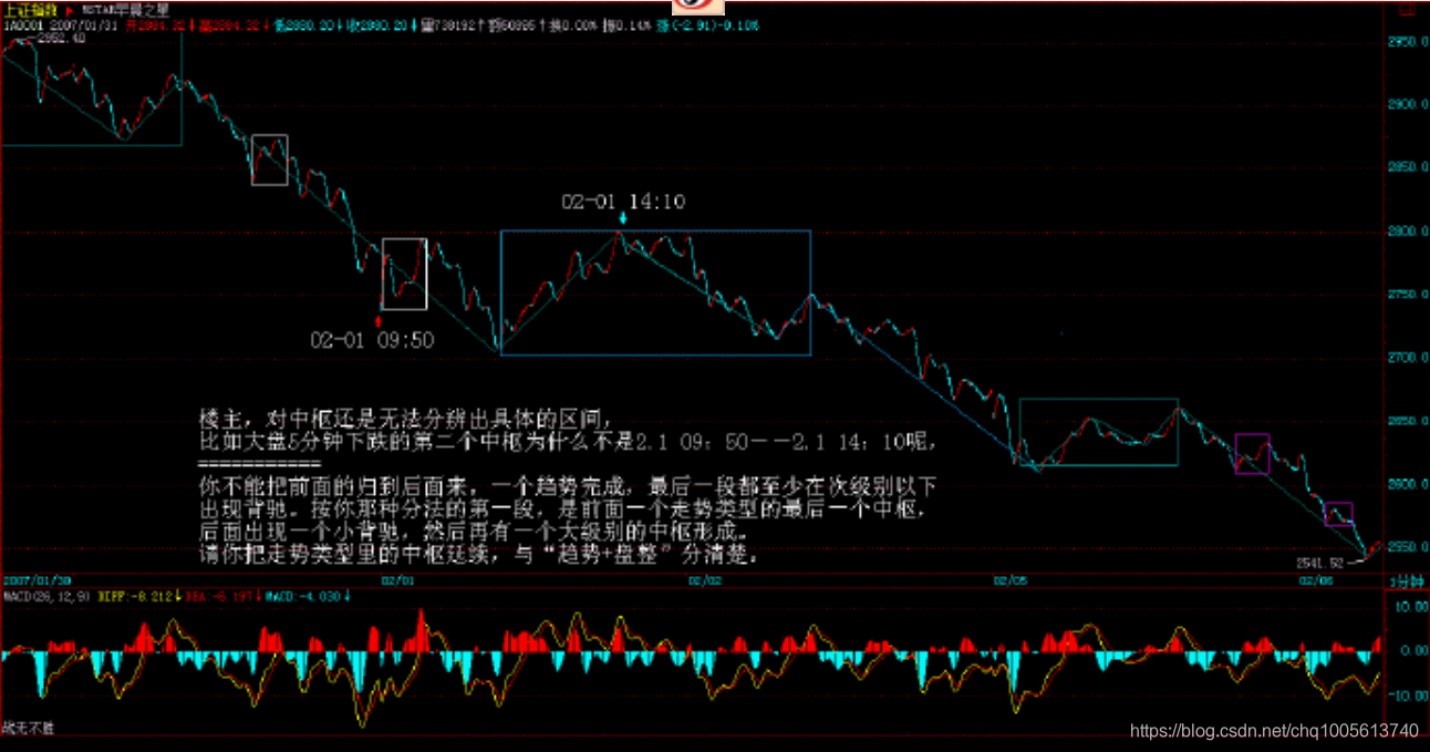 楼主,对中枢还是无法分辨出具体的区间,比如大盘5分钟下跌的第二个中枢为什么不是2.1 09:50--2.1 14:10呢,有什么道理呀?我搞不太明白?我想你会说2.1 09:50--2.1 11:05不是一个次级别的走势,那我想问一下,如何在5分钟的图上可以比较方便的分辨出5分钟的中枢,或是在日线图上可以分辨日线的中枢而不是看30分钟或60分钟图,谢谢!!!