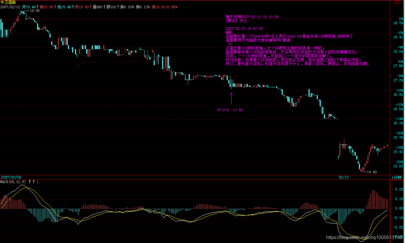 还是光看1分钟的背驰,这个问题和上面的回答是一样的,就是要首先看大级别的背驰段,然后再按区间套的方法看小级别来精确定位。否则,一个1分钟的背驰,可能就以一个盘中的震荡就化解了。针对该股,如果看大级别的图,用走势必完美,就知道第三段的下跌是必然的。所以,要先看大级别,知道大级别再干什么,再看小级别。要综合、系统地看问题。