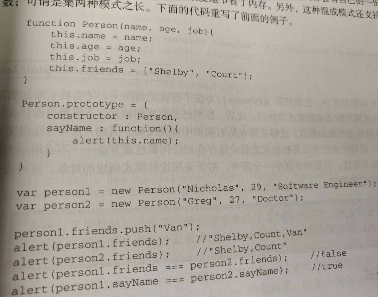 构造函数用于实例属性,原型模式用于方法和共享方法。
